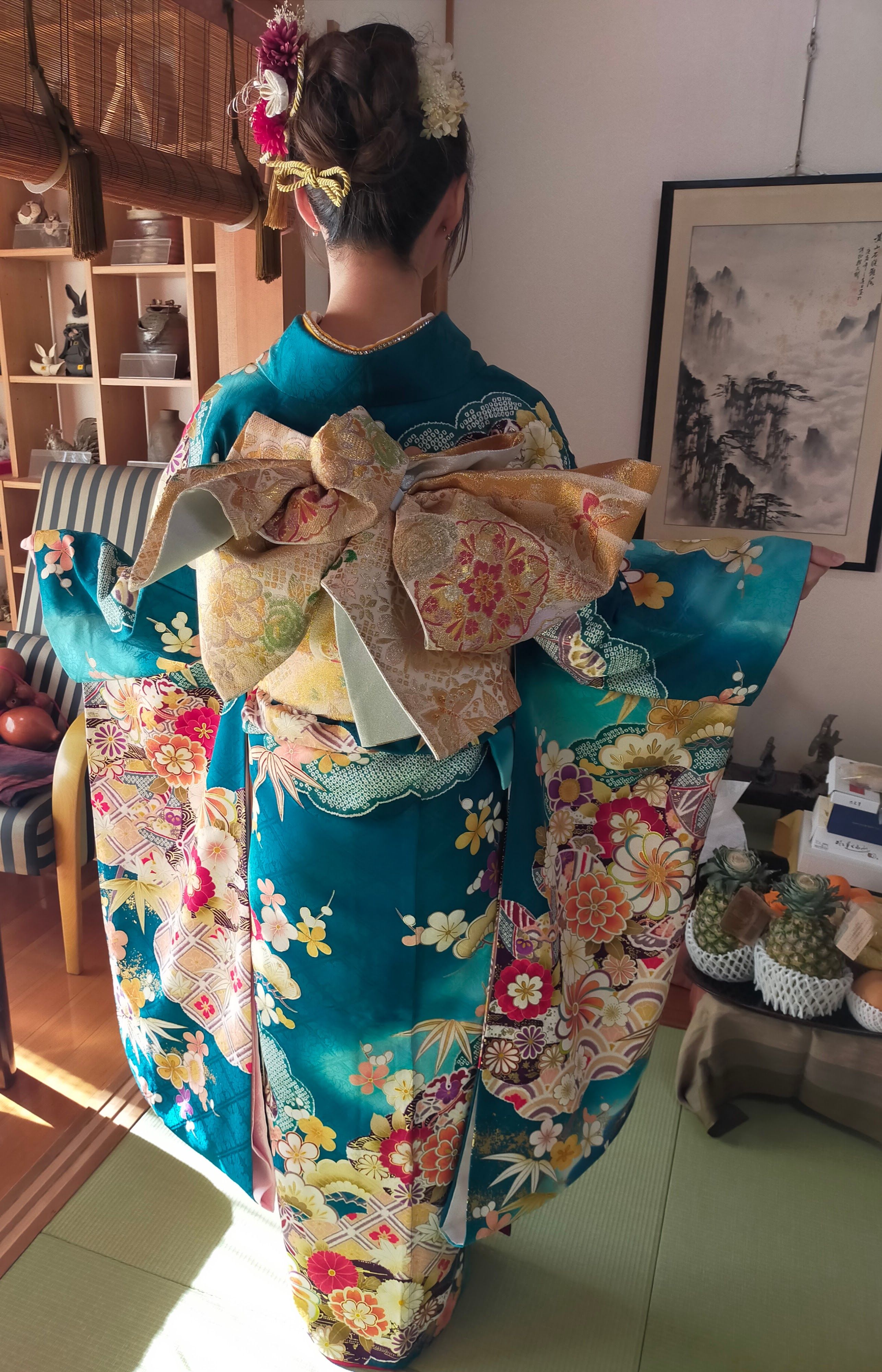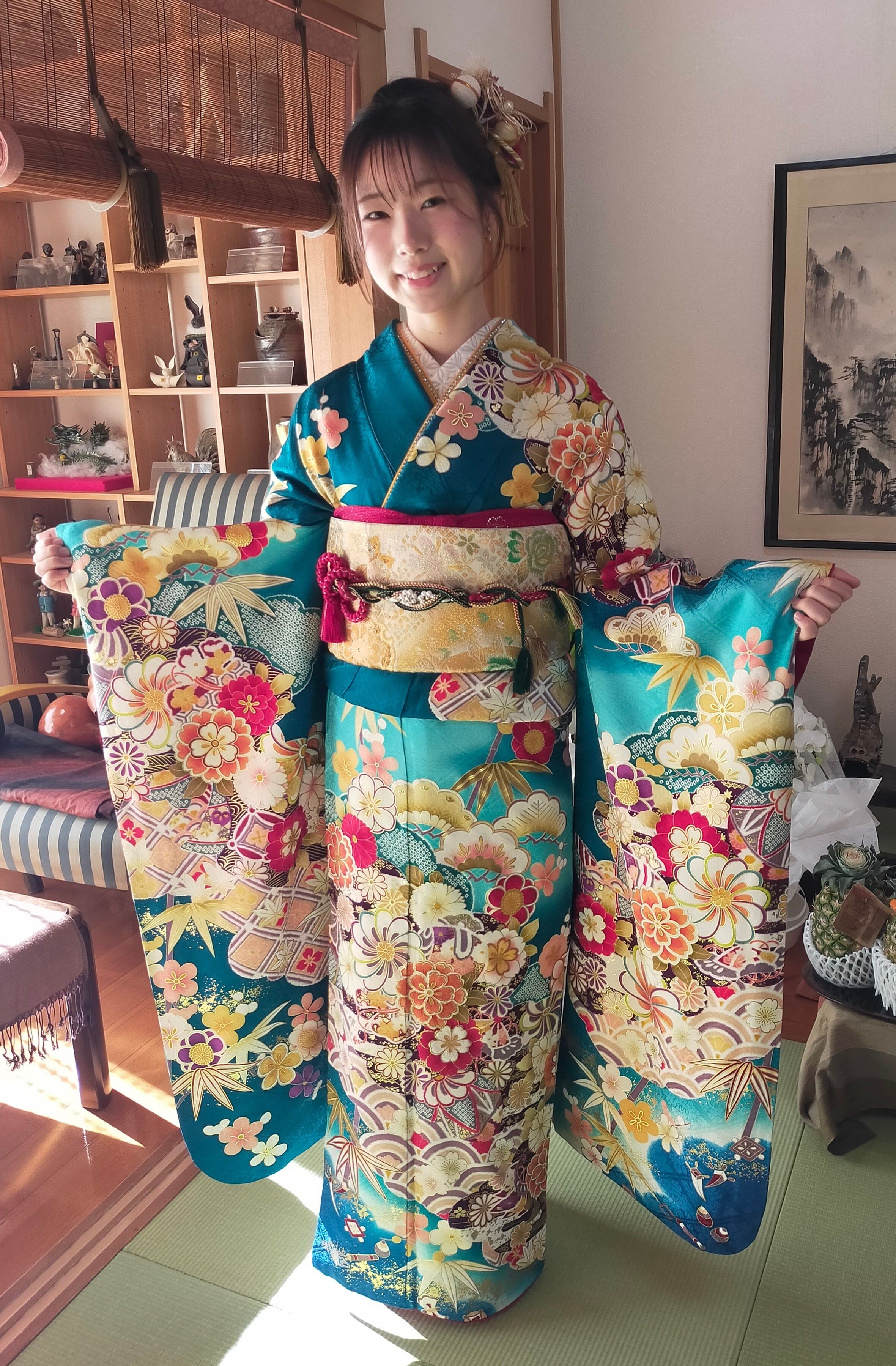 さて、新年最初のお客様は振袖のお嬢様。もうすぐ成人式だそうです。