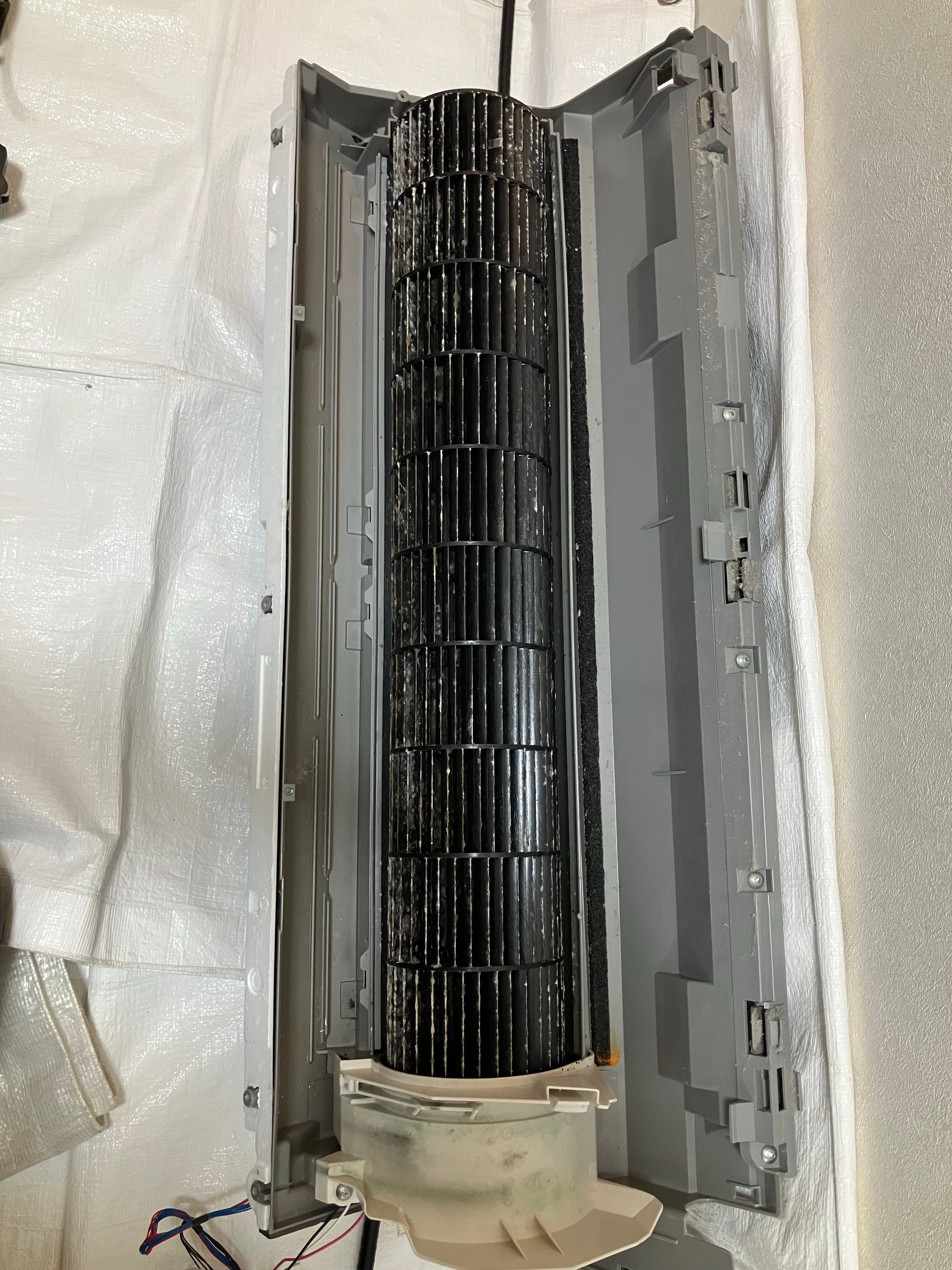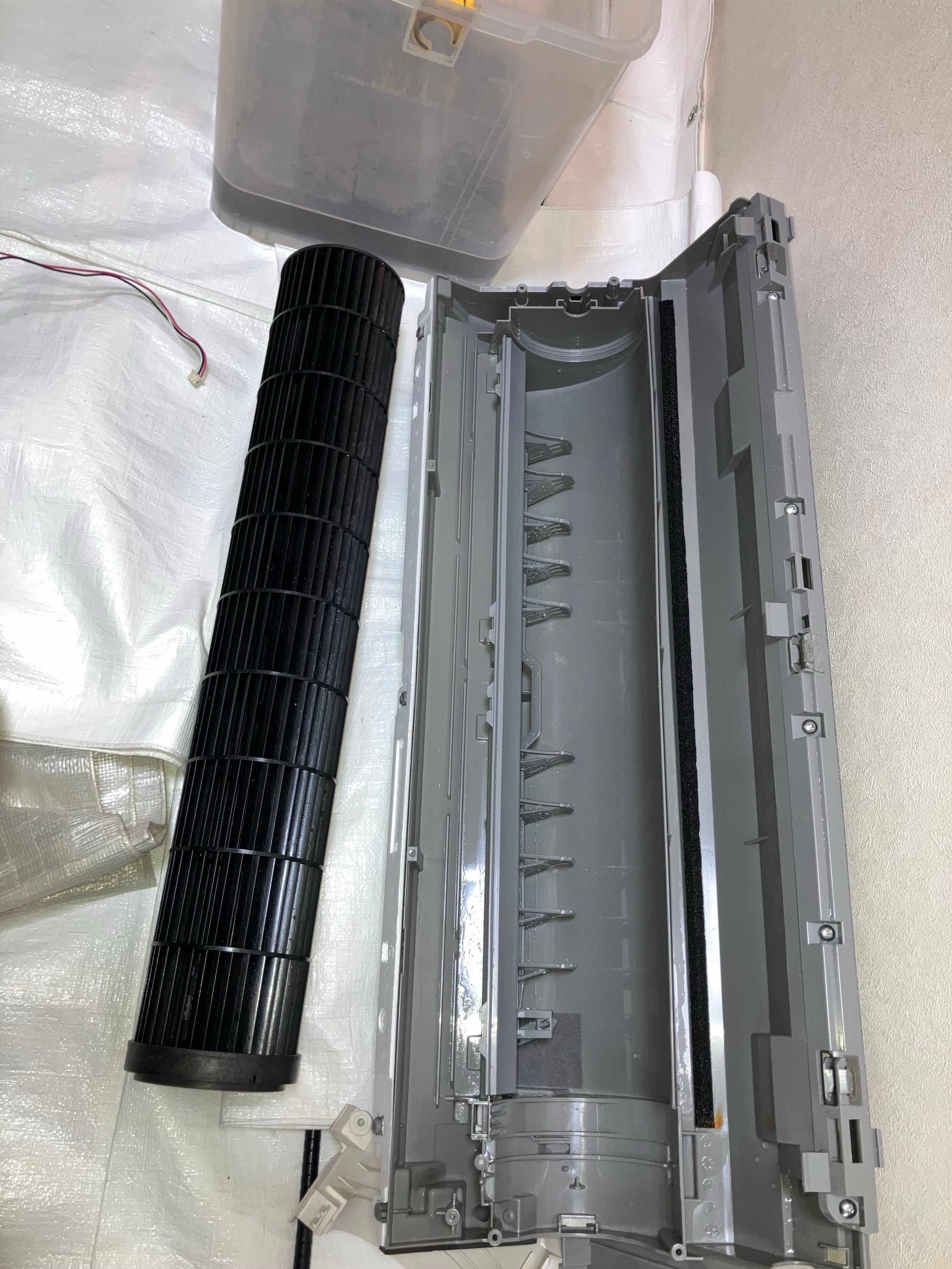 ドレンパン、送風ファン、モーターを取り外して内部を完全分解。
