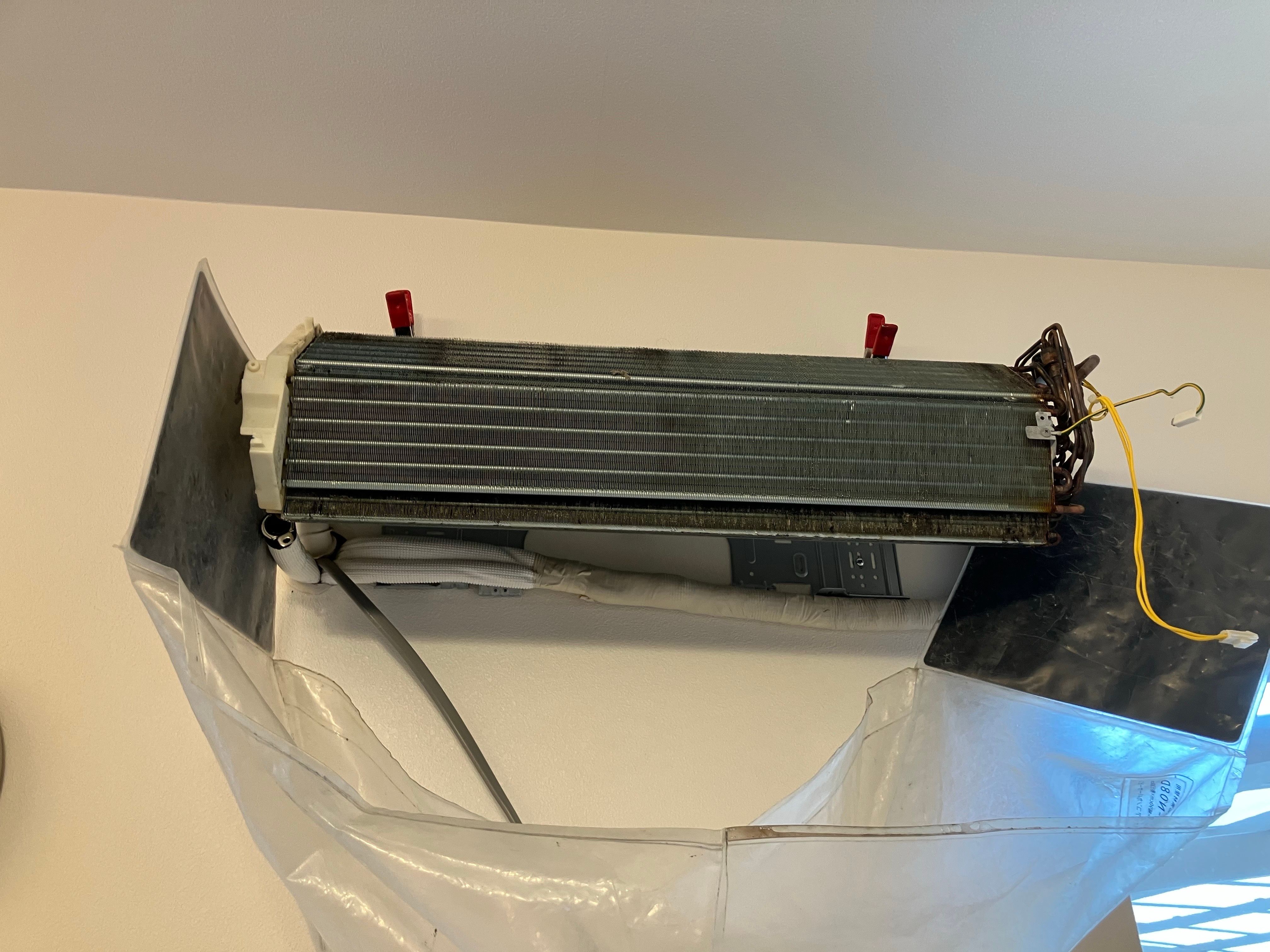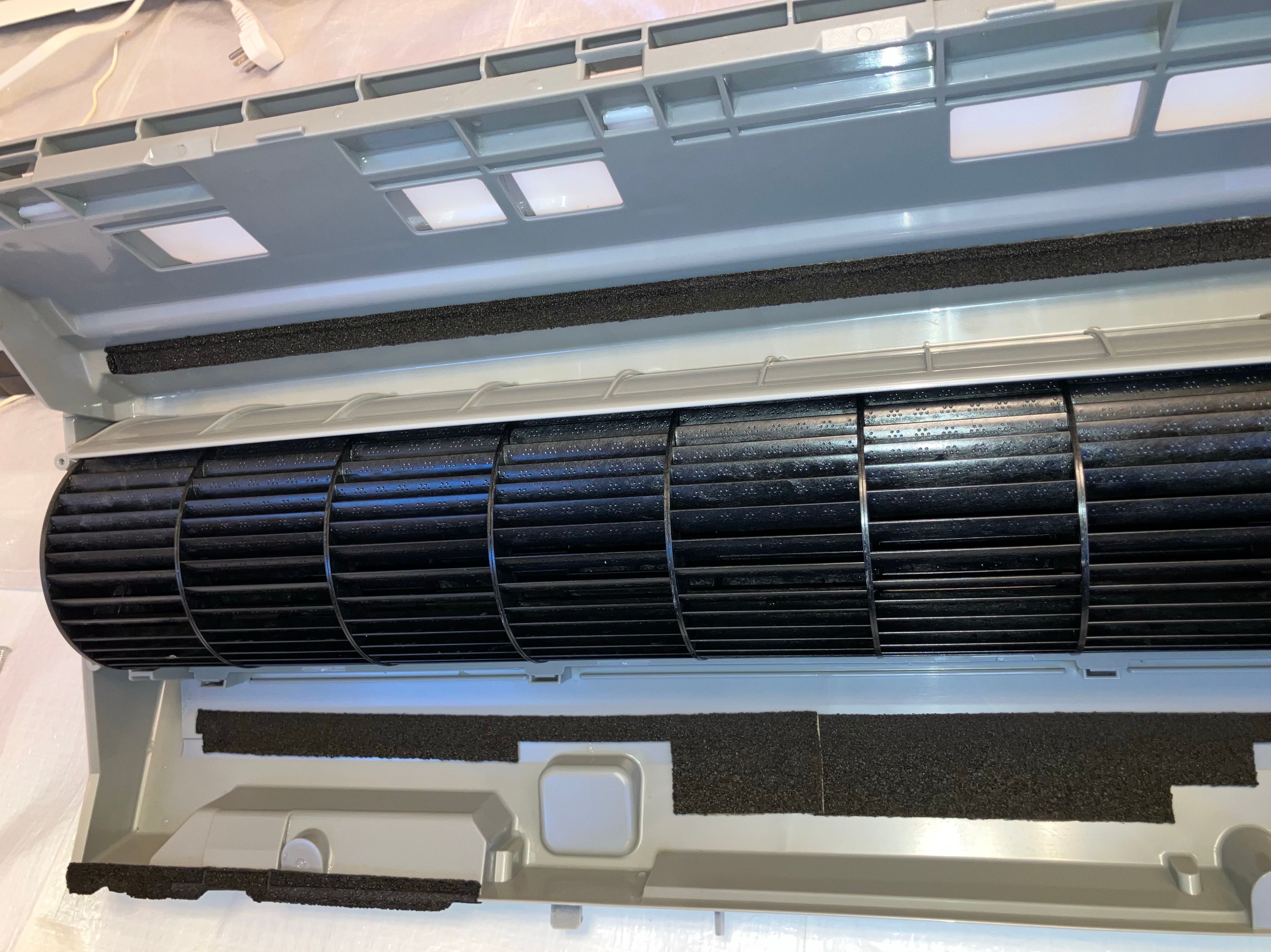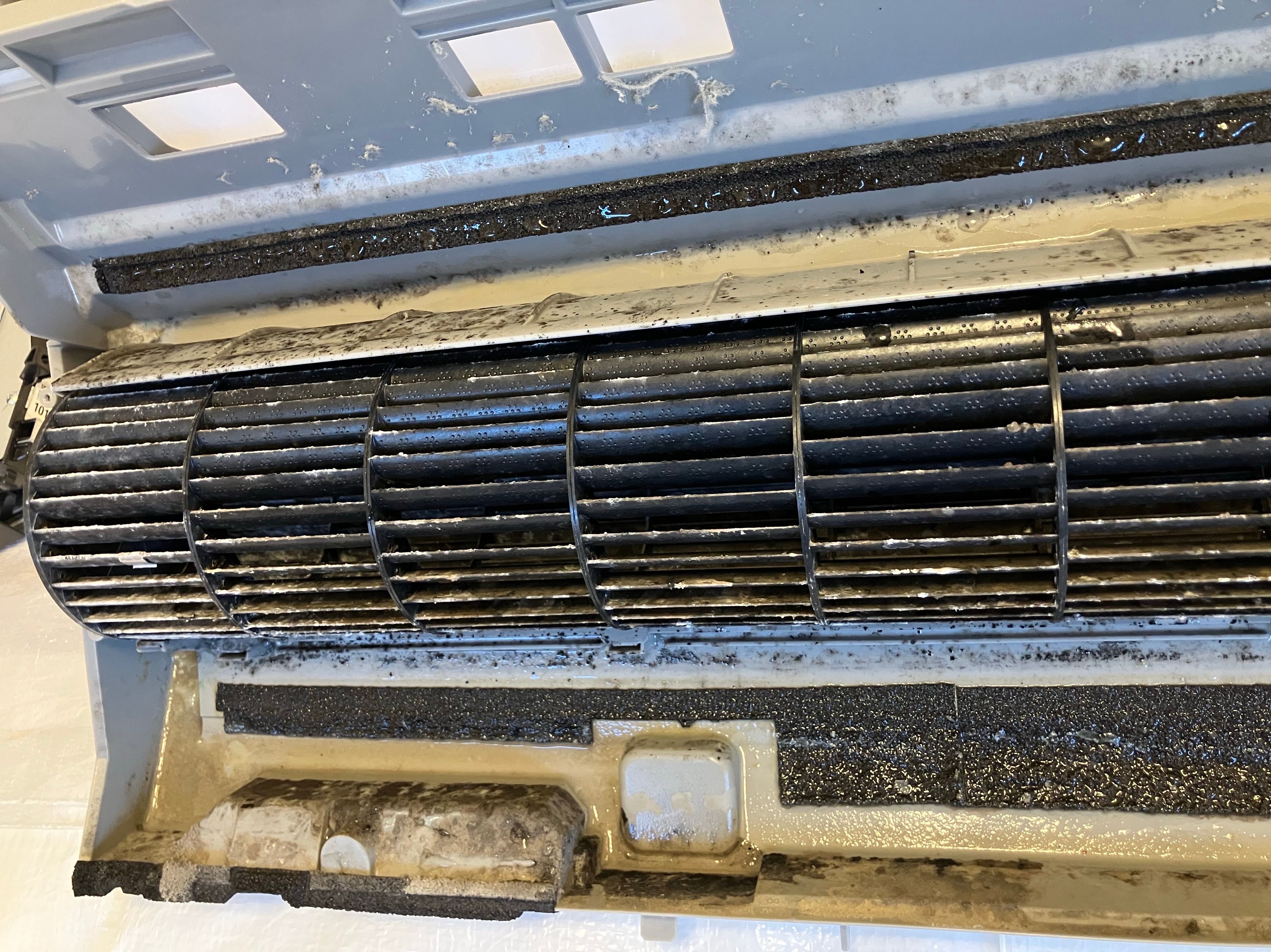 「最近エアコンから水が漏れてきたが、汚れが原因かもと修理の人から言われて依頼した」とのことで、今回が初めての完全分解洗浄でした。