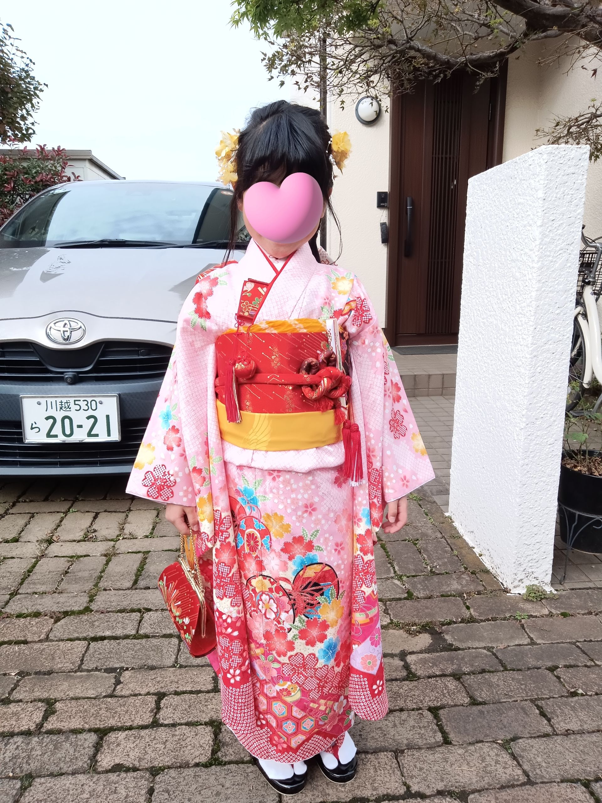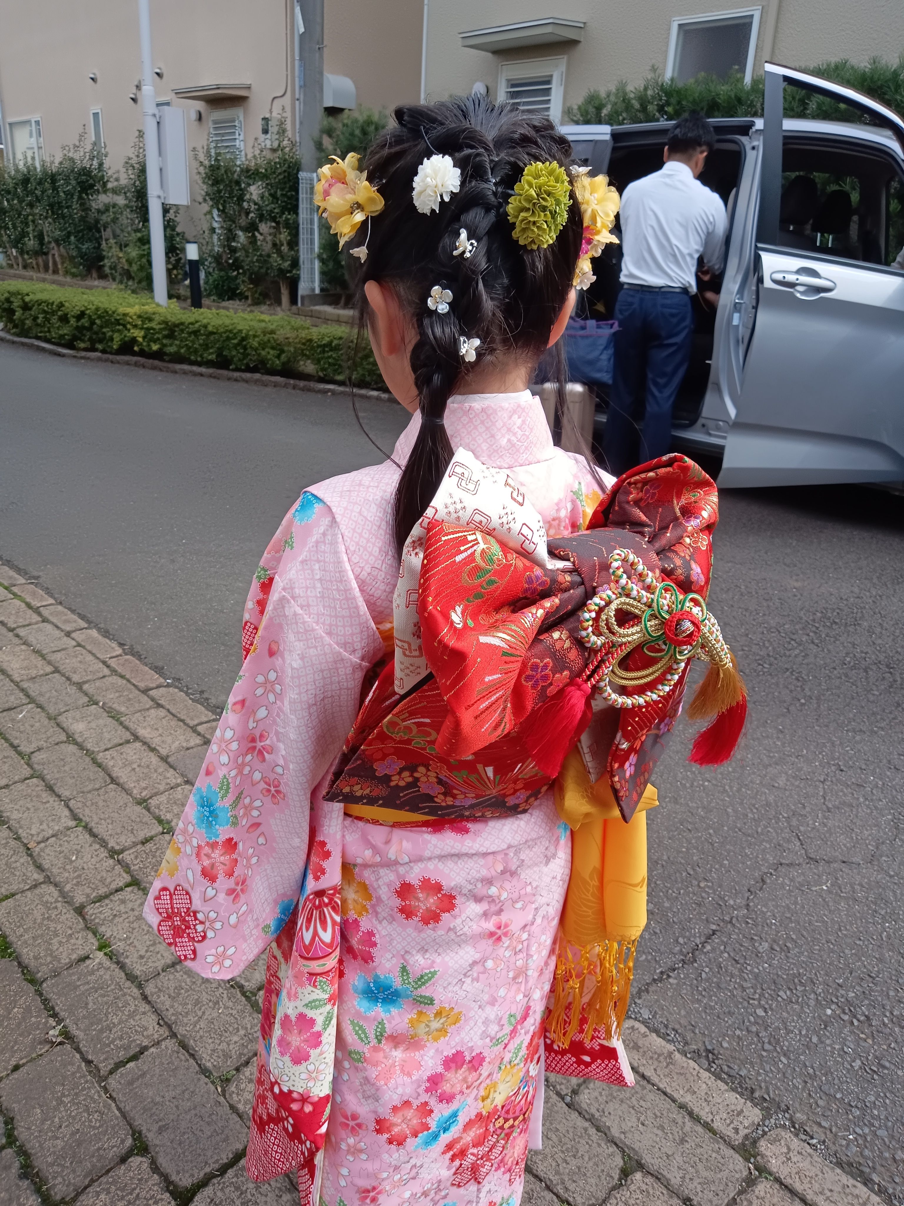 7歳様の着付、ヘアセット髪は長めでエルサのようにとのご希望。可愛いらしいお嬢様、お着物はレンタルでした。