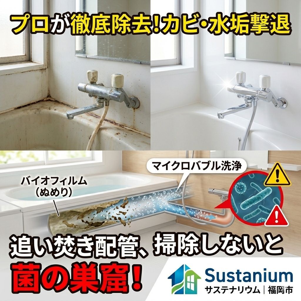 福岡で住まいの快適さをサポートする「サステナリウム」が、プロによる浴室クリーニングの驚きのメリットと、見落とされがちな「追い焚き配管洗浄」の重要性について、徹底解説します。