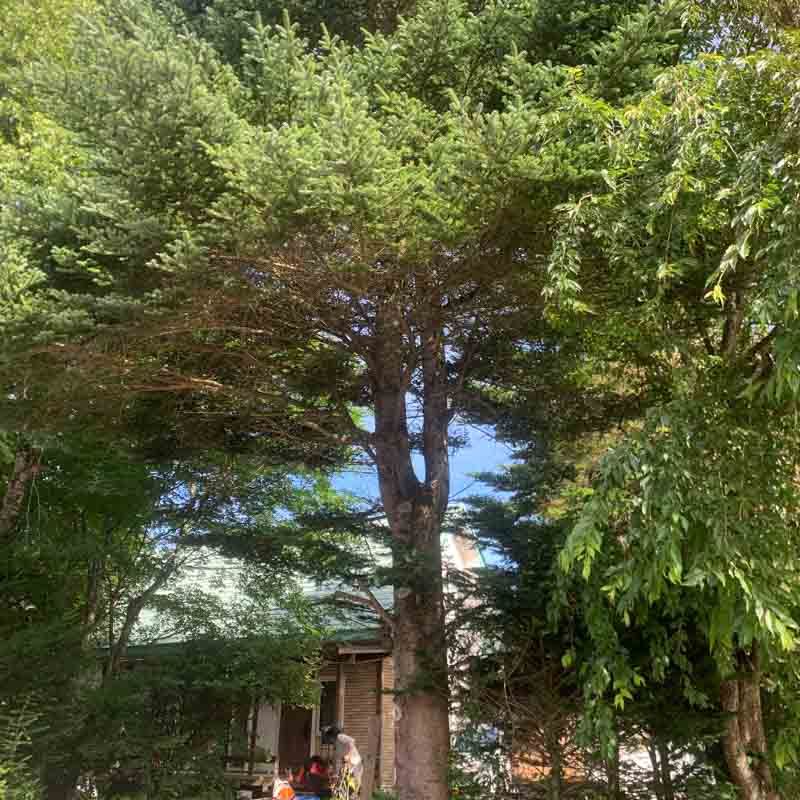 中軽井沢の住宅地で電線に干渉してしまっているモミの枝払いを特殊伐採で対応させていただきました。