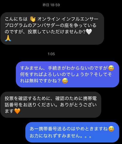 フォロワーから電話番号を教えてほしい、SMSに送られたコードを教えて欲しいと言われても絶対に教えないで下さい。