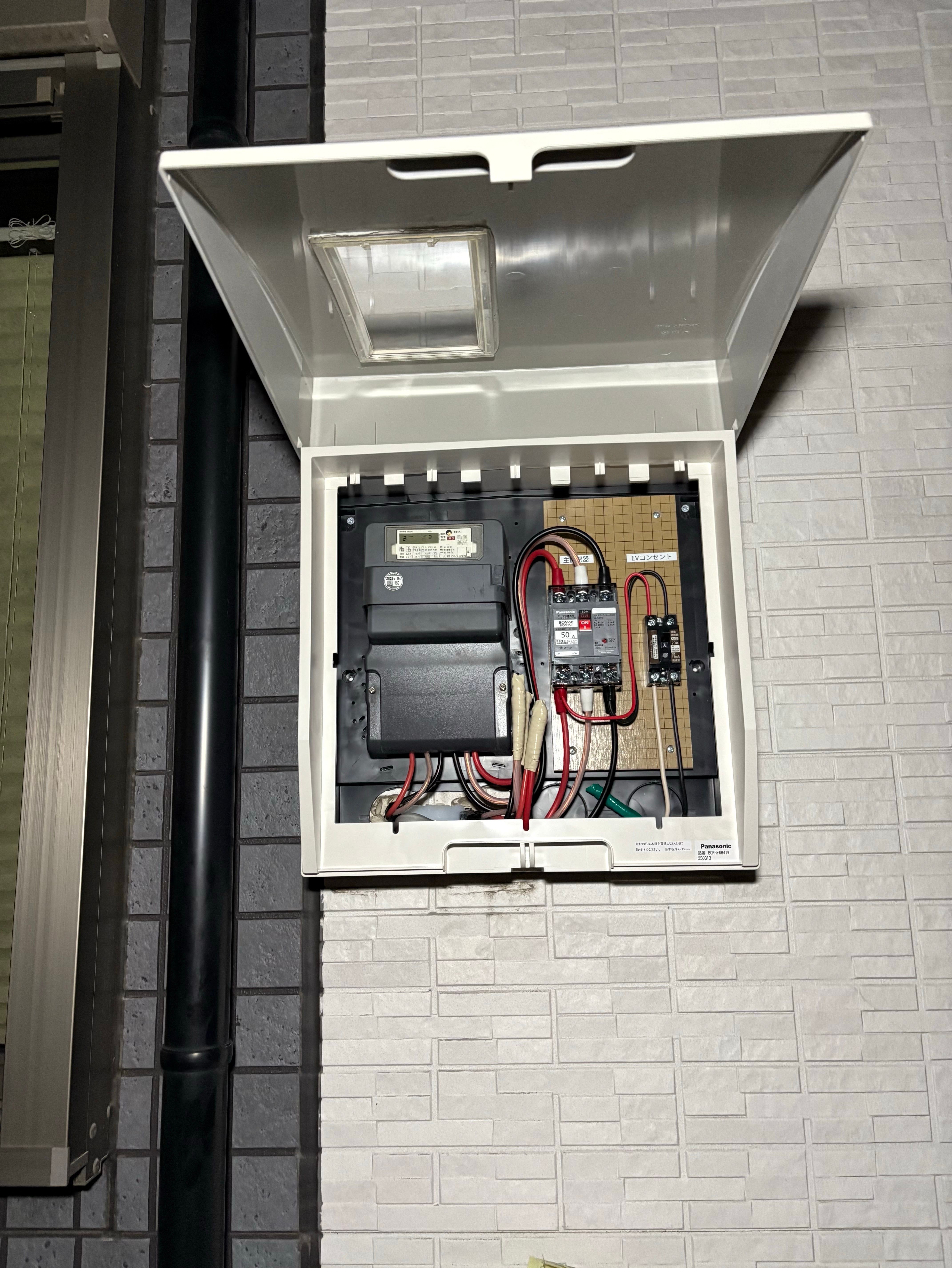 既存のメーターボックスを パナソニック製のものに取り替え、ボックス内にブレーカーを増設。そこからEVコンポプライムまで配線を行いました。