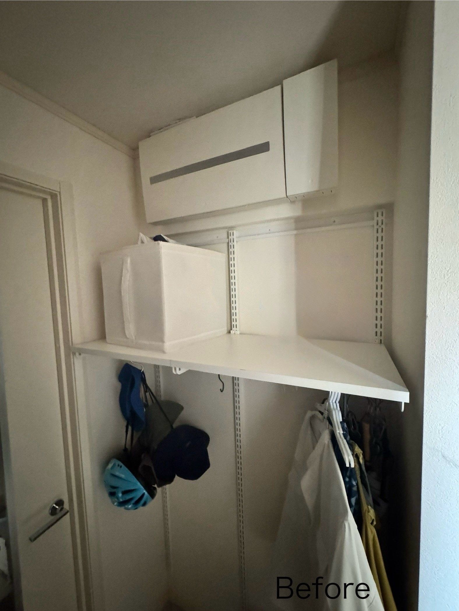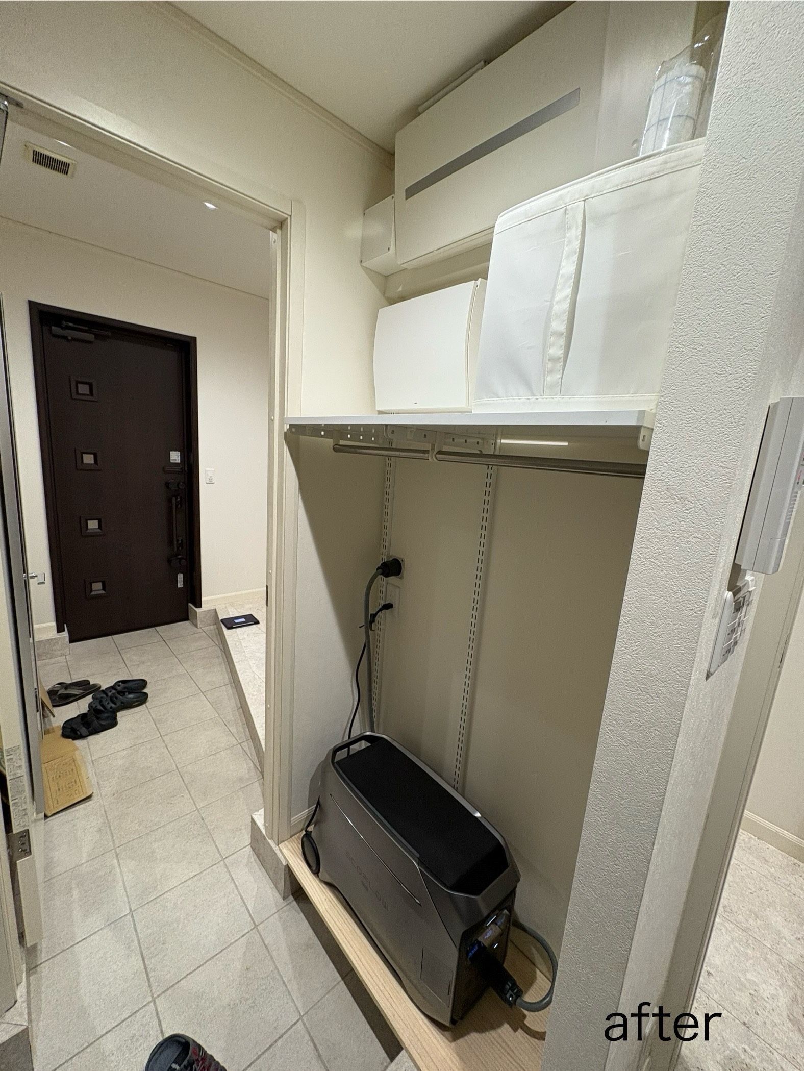 設置場所はシューズクロークの一角で、壁の内側が引き戸の戸袋になっており、隠蔽配線が非常に困難な状況でした。