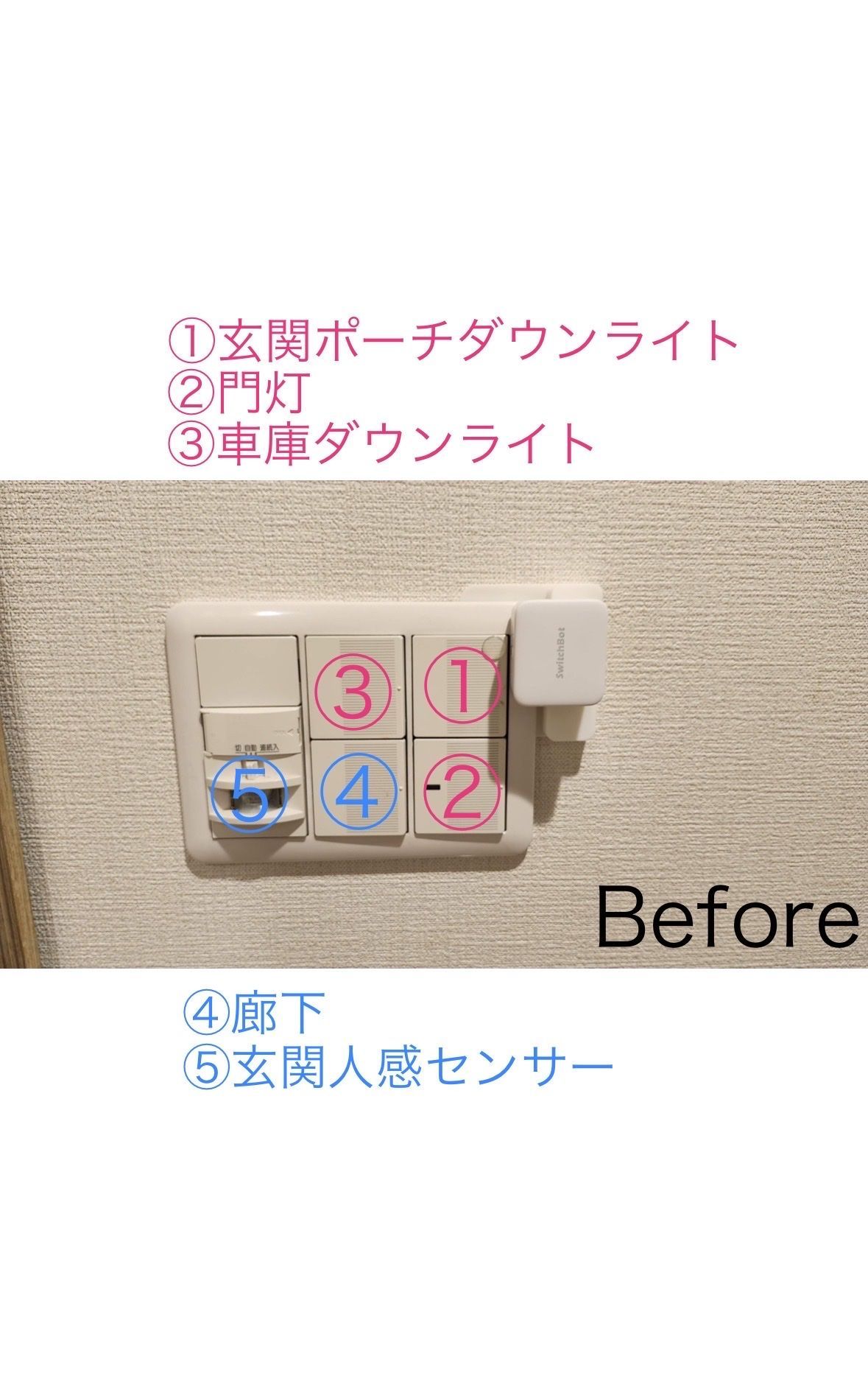 これで1つのスイッチボットで①玄関ポーチ②門灯③車庫が入り切りできるようになりました。