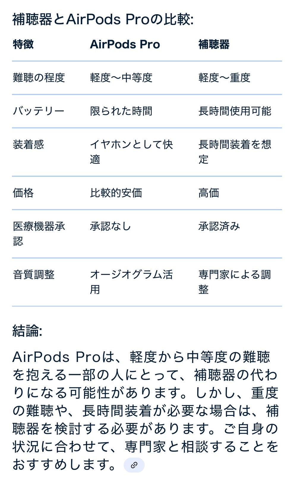 逆に、AirPods Pro 2(2が書くのに邪魔くさい)の外部音の取り入れを使ったら補聴器の代わりになるのかなあと思いましたので、調べてみたら、なるみたいですね。(今は調べるといってもAIに聞いてみたと言ったほうがいいでしょうし、今後そういう表現に変わっていくでしょう)