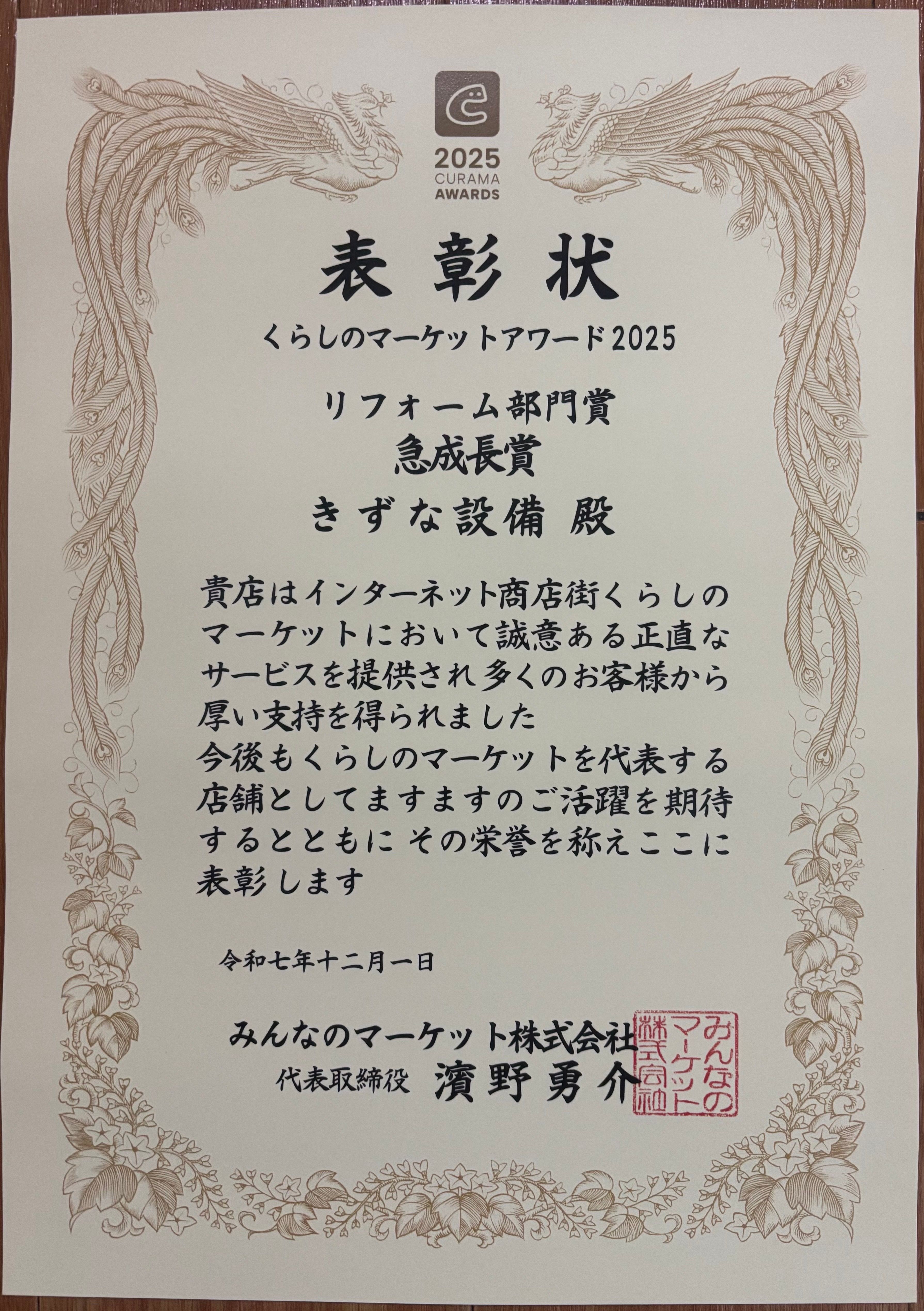 この度、くらしのマーケットアワード2025のリフォーム部門で、きずな設備がノミネートされ、急成長賞を頂きました(^-^)v
