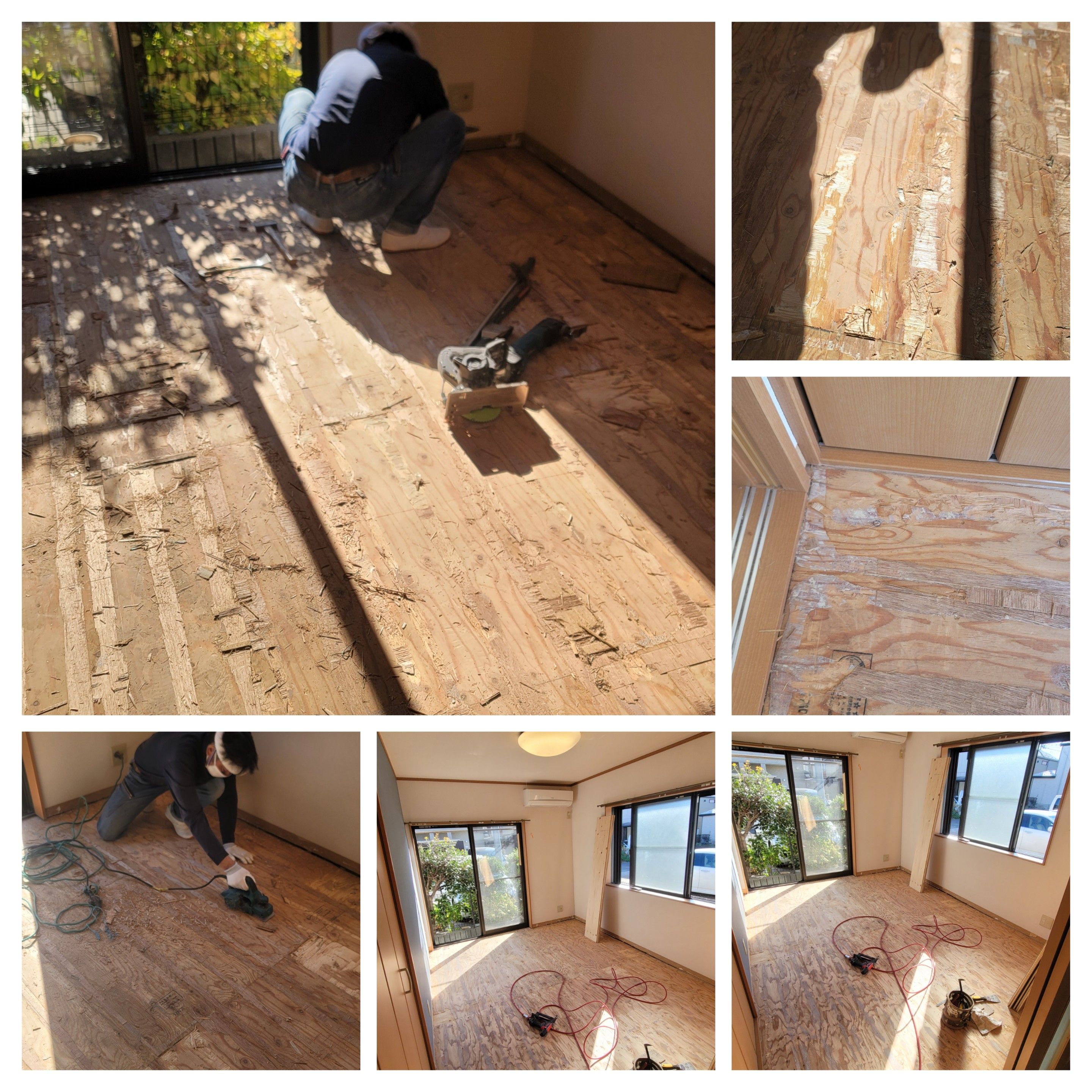 今回はまずフロアタイルとフローリングをすべて解体し、下地のベニアを電動カンナで丁寧にケレン処理。