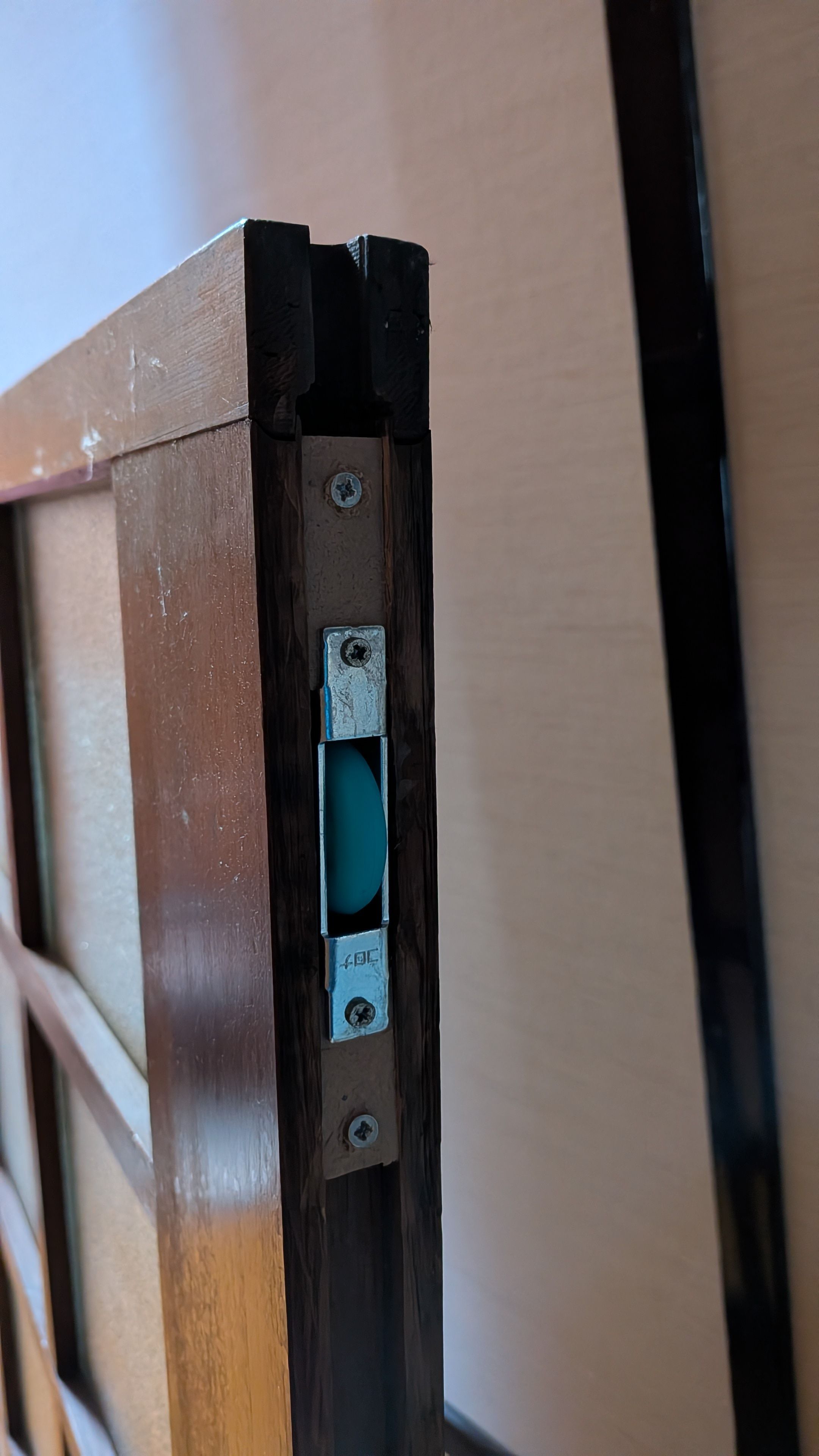 埋木をして取り付けたVレール用静音戸車