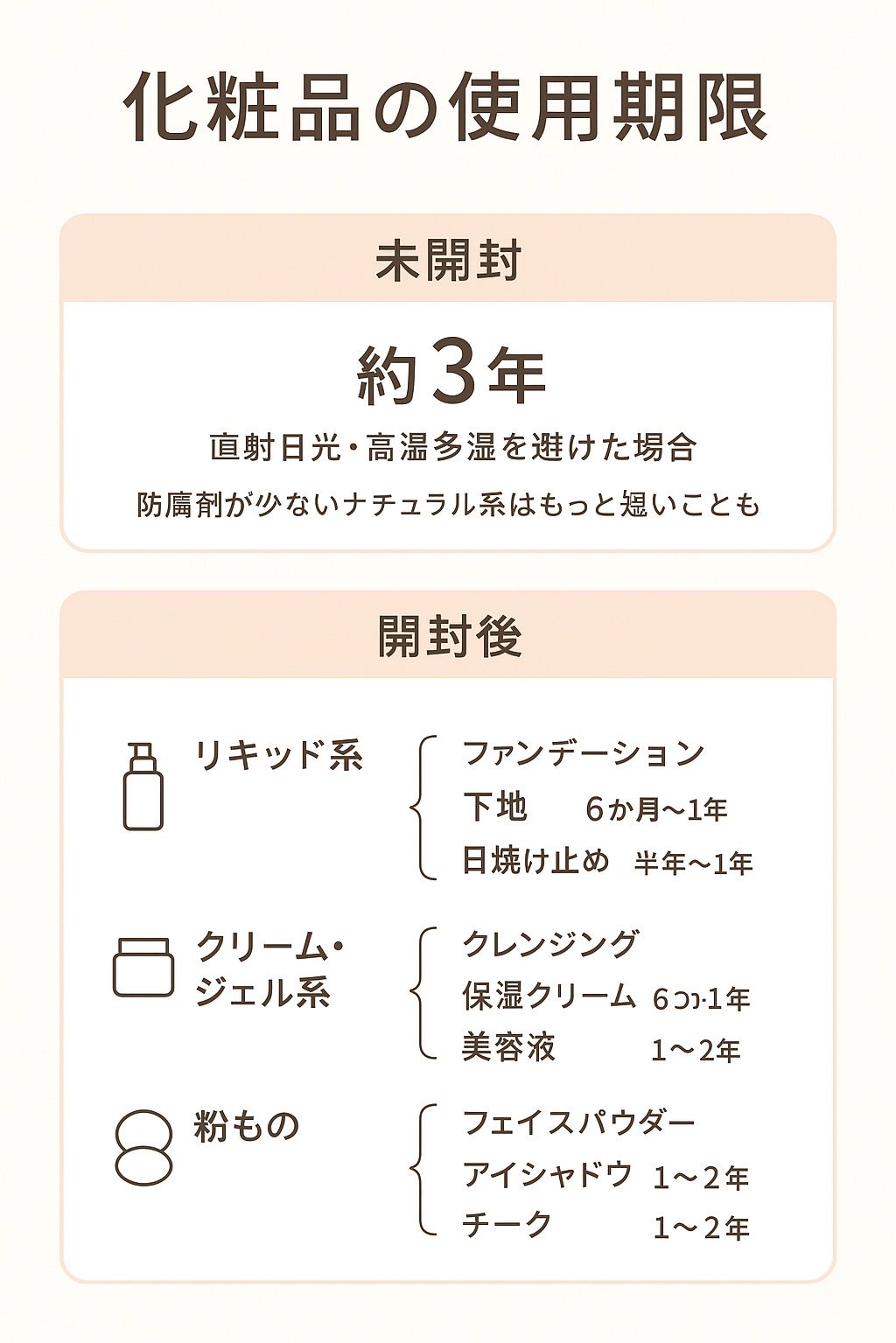 毎日使う化粧品。実は“使用期限”があるって知っていますか?見た目が変わらなくても、雑菌が増えたり成分が劣化して肌トラブルの原因になることも。今回は、アイテム別にわかりやすく使用期限をまとめました😉