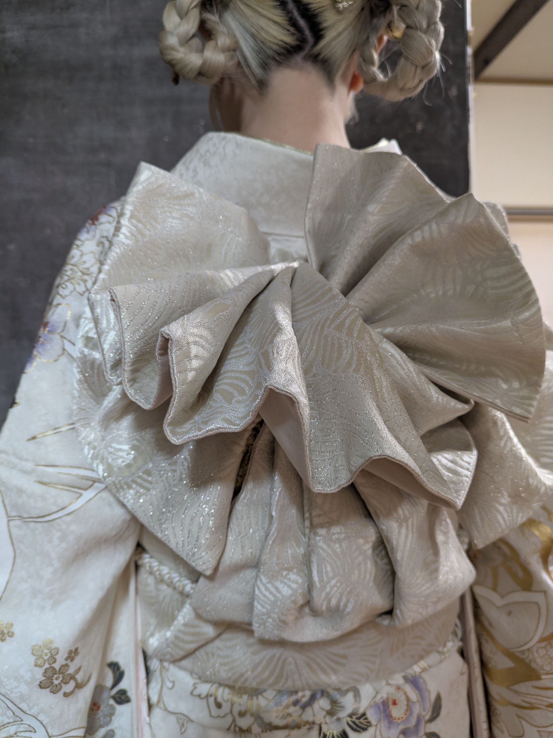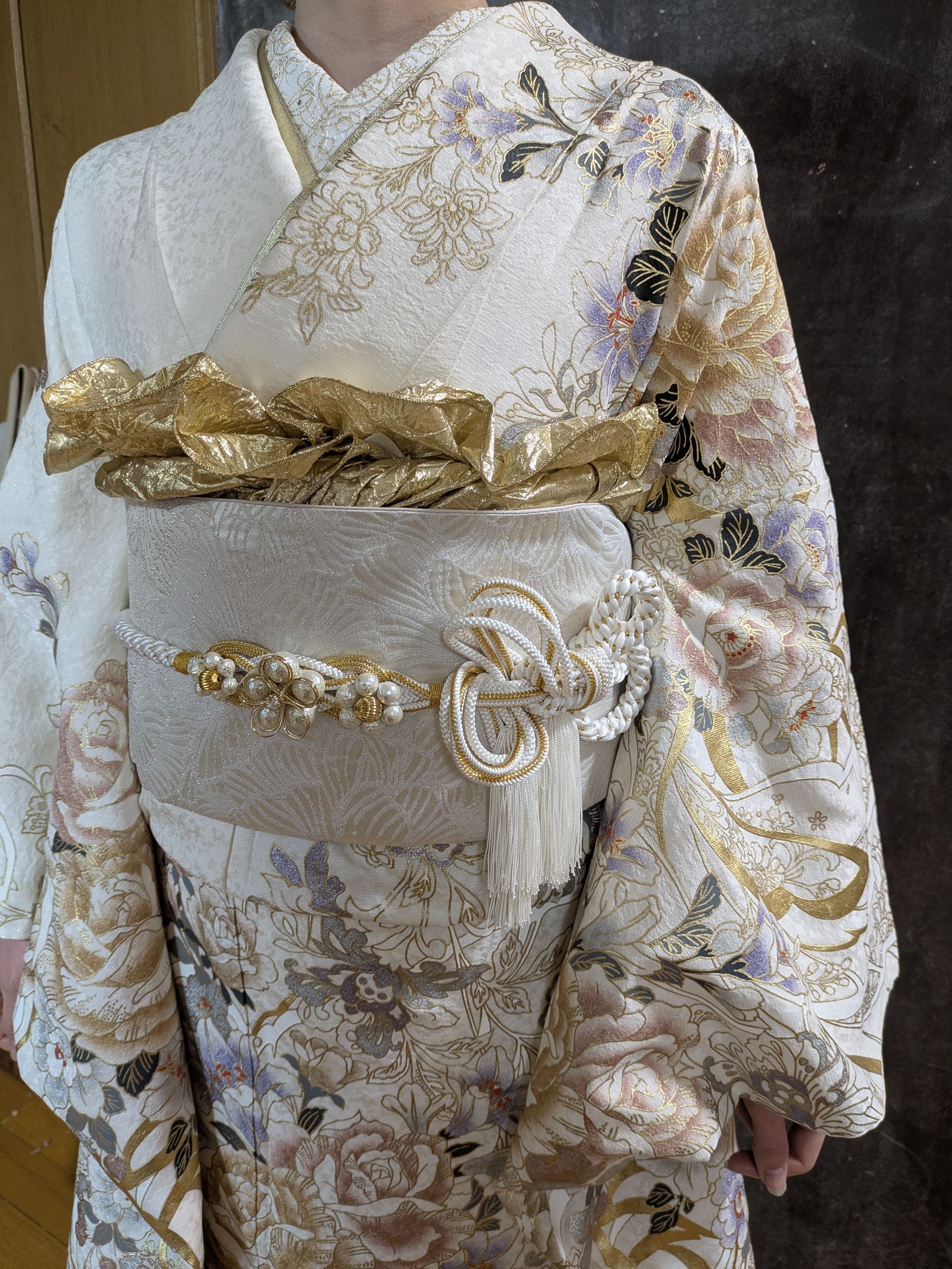 せっかくレンタルしたお着物、返却する前にもう一度着たいとのことでご依頼いただきました。白い着物は今年のトレンド。レンタルしたセットに加え、刺繍半衿やゴールドの帯揚げなど、ご自身で追加で手配されたこだわりのコーディネート。ゴールドの効かせ色がステキで、とても良くお似合いでした。