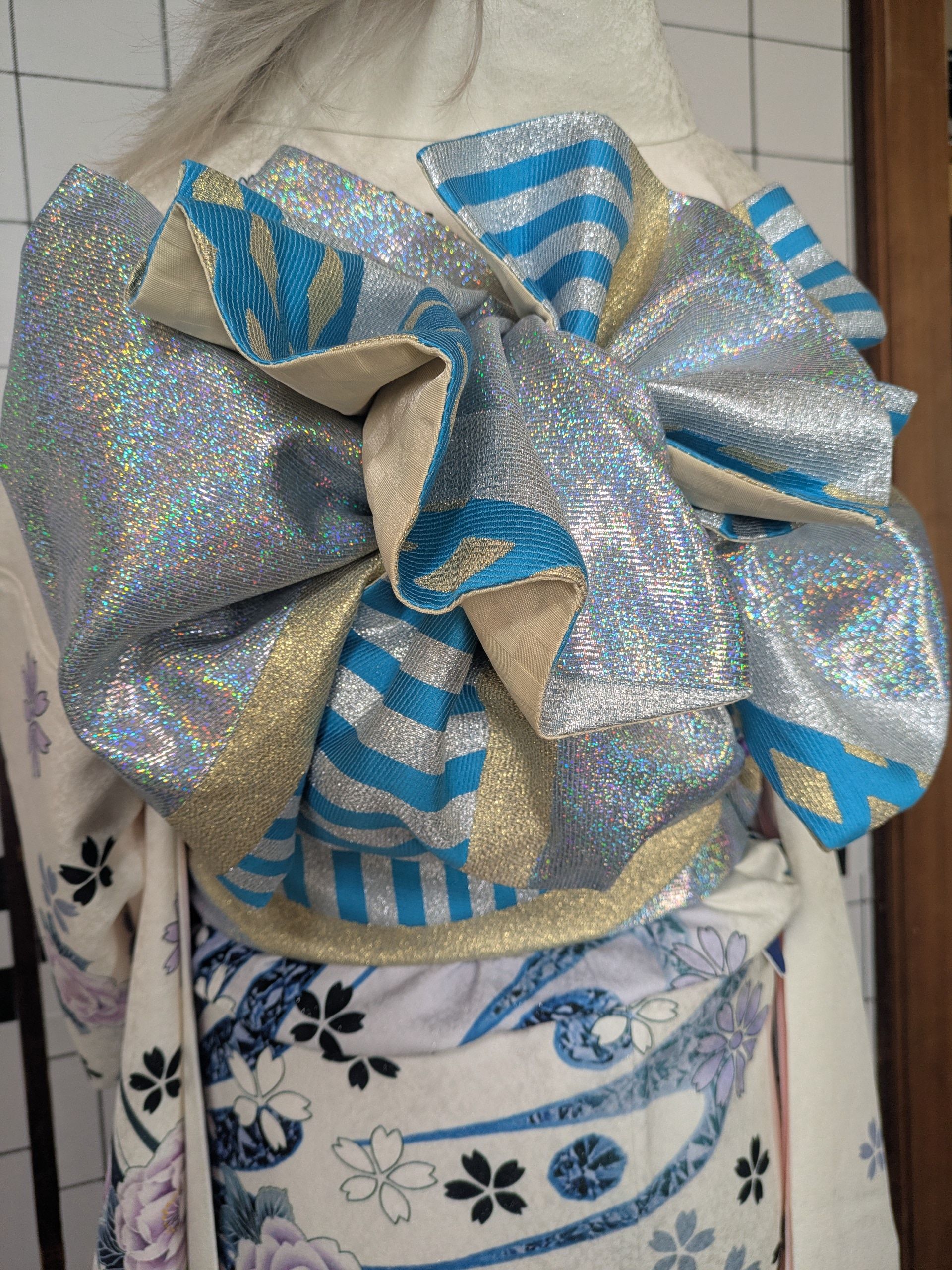水色とシルバーが効いたポップな帯におばさん悶絶(笑) 今ってこんなにポップでかわいい袋帯があるんですねぇ。「いや〜!超かわいい~!」って思わず口走り、仕事を忘れてただの着物好きになってしまった瞬間でした。