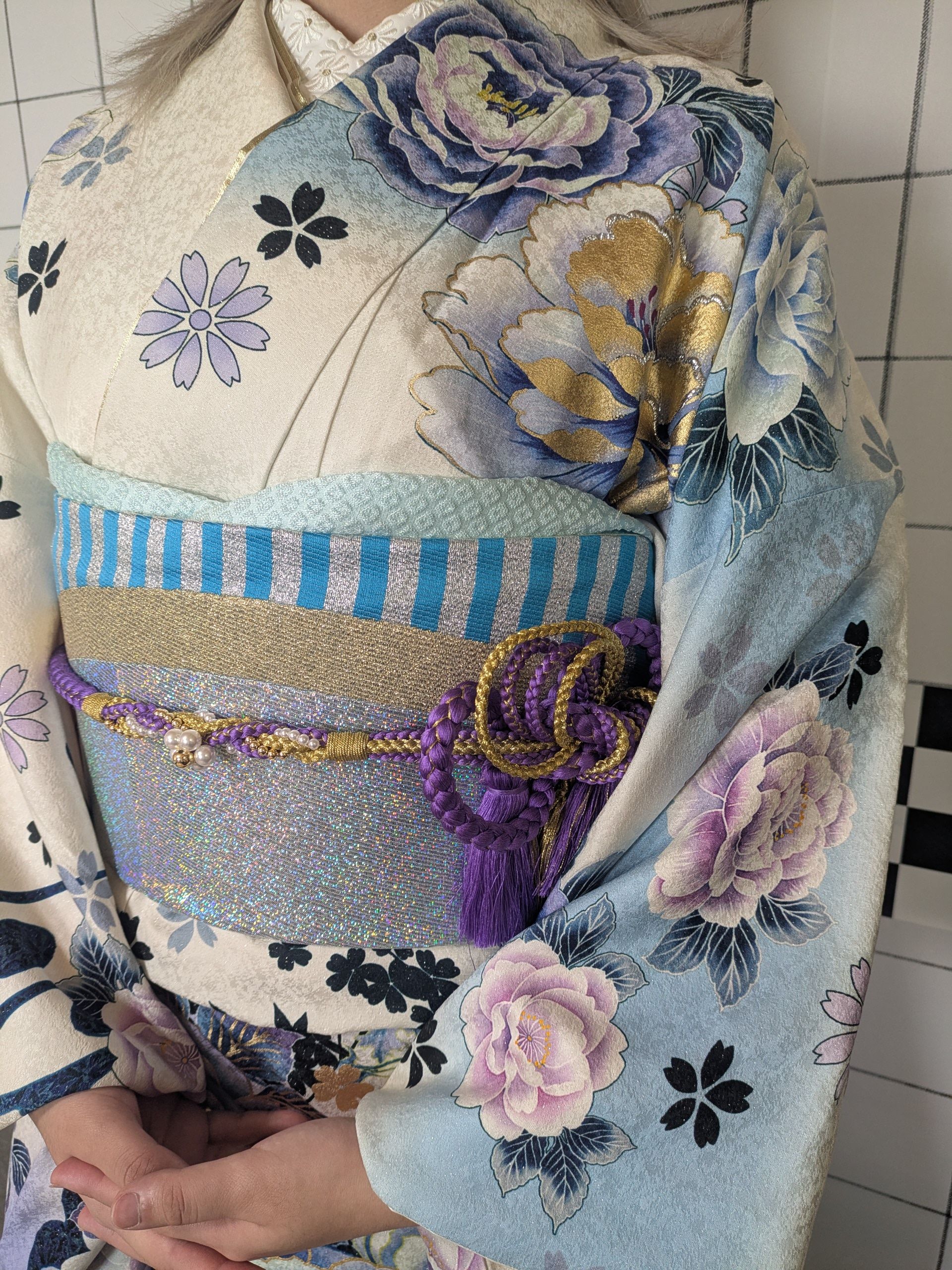 画像にはチラリとしか映っていませんが、この日のためにお嬢さんは髪色をシルバーにされていて、そのお色がブルー系のお着物にすごく似合っておられたのですよ!