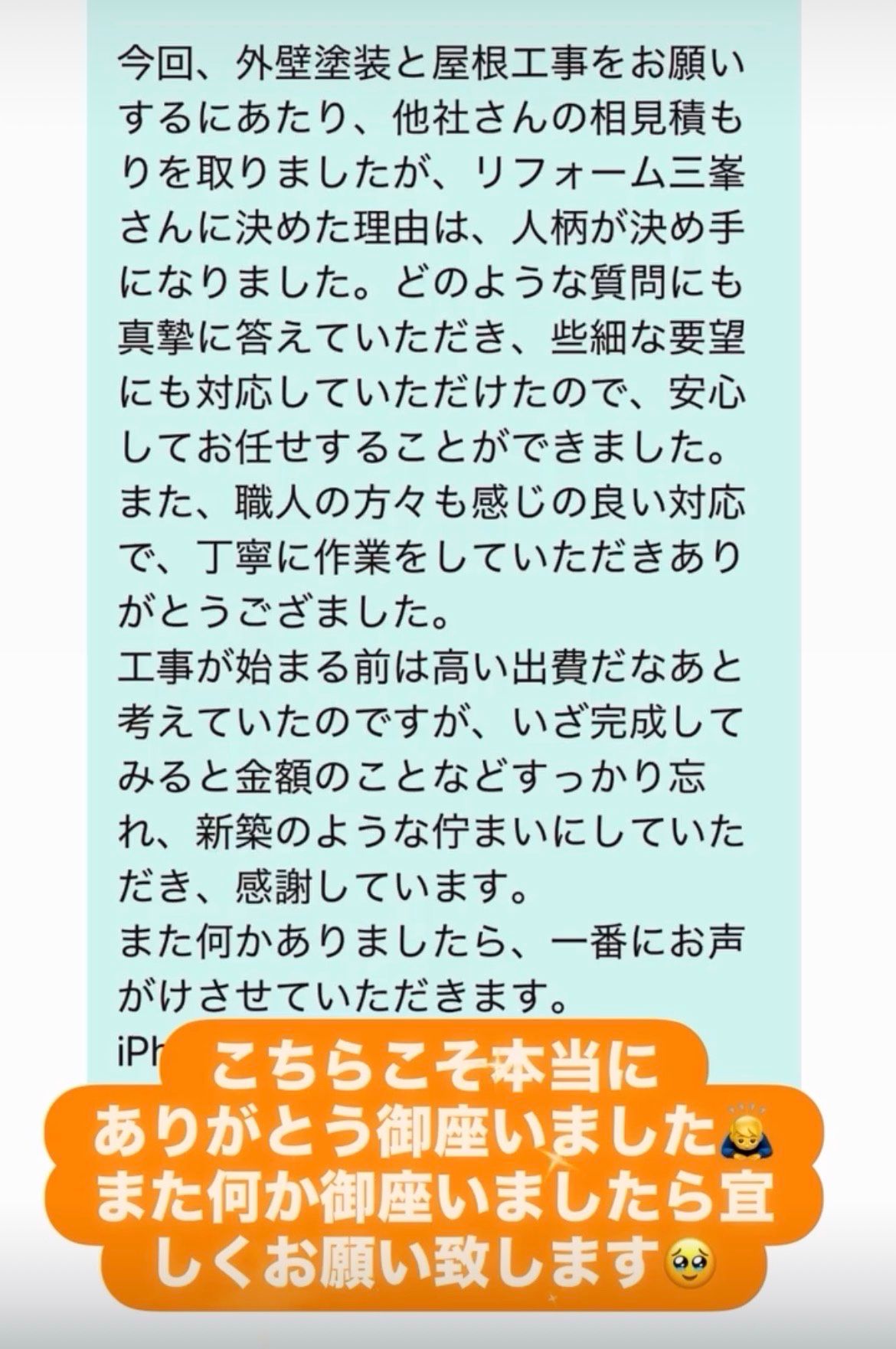 こちらこそ本当にありがとう御座います🙇♂️励みになる御言葉ありがとう御座いました🥹✨これからも住宅専門リフォーム三峯を宜しくお願い致します🙇♂️