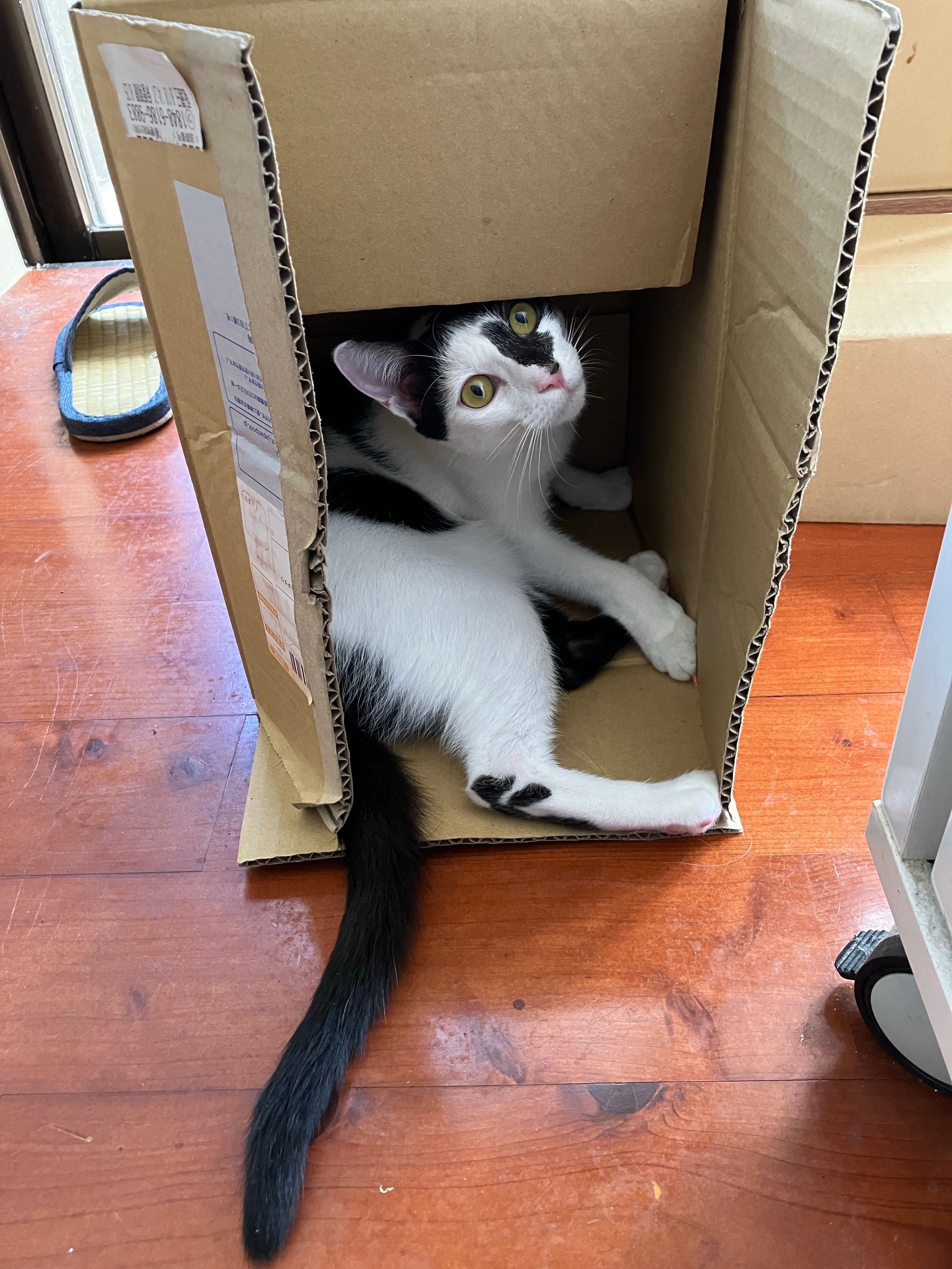 リビングの段ボールに入った猫ちゃんが「私可愛いでしょ」と言わんばかりの顔でこちらを見ていました。