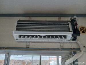 このたびは、シャープセパレート形エアコンAY-N22N-W 2022年製の分解クリーニングを行いました。 自動お掃除機能なしのシンプルな構造でしたので、何不自由もなくスムーズに行えました。 室外機を洗浄、ドレインホースを洗浄して防虫キャップを取り付けて、ベランダとサッシのお掃除もしました。