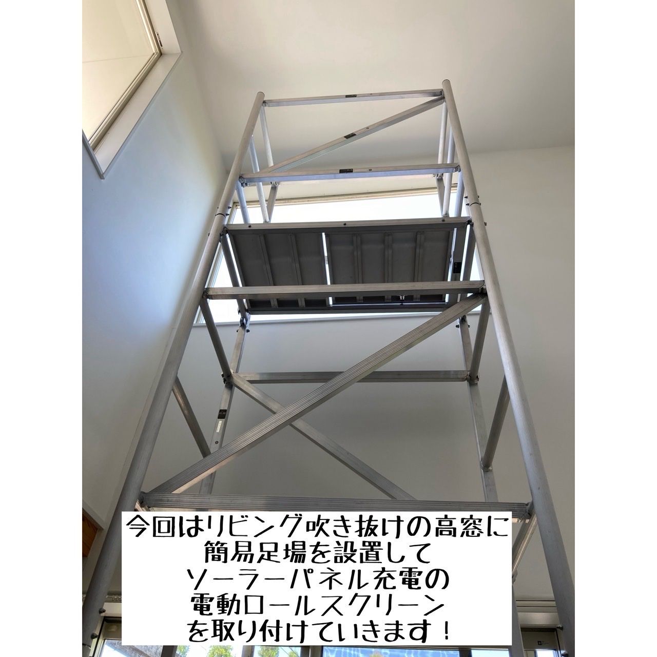 【ソーラーパネルで充電】高さ約5m 吹き抜け高窓に電動ロールスクリーンを取り付けました【コンセント不要】