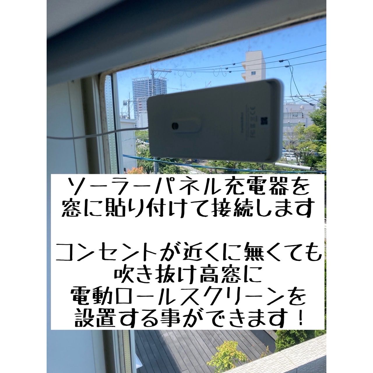 窓面の太陽光が当たる位置にソーラーパネルを貼り、窓枠上に電動ロールスクリーンを設置して接続すれば完了です😃