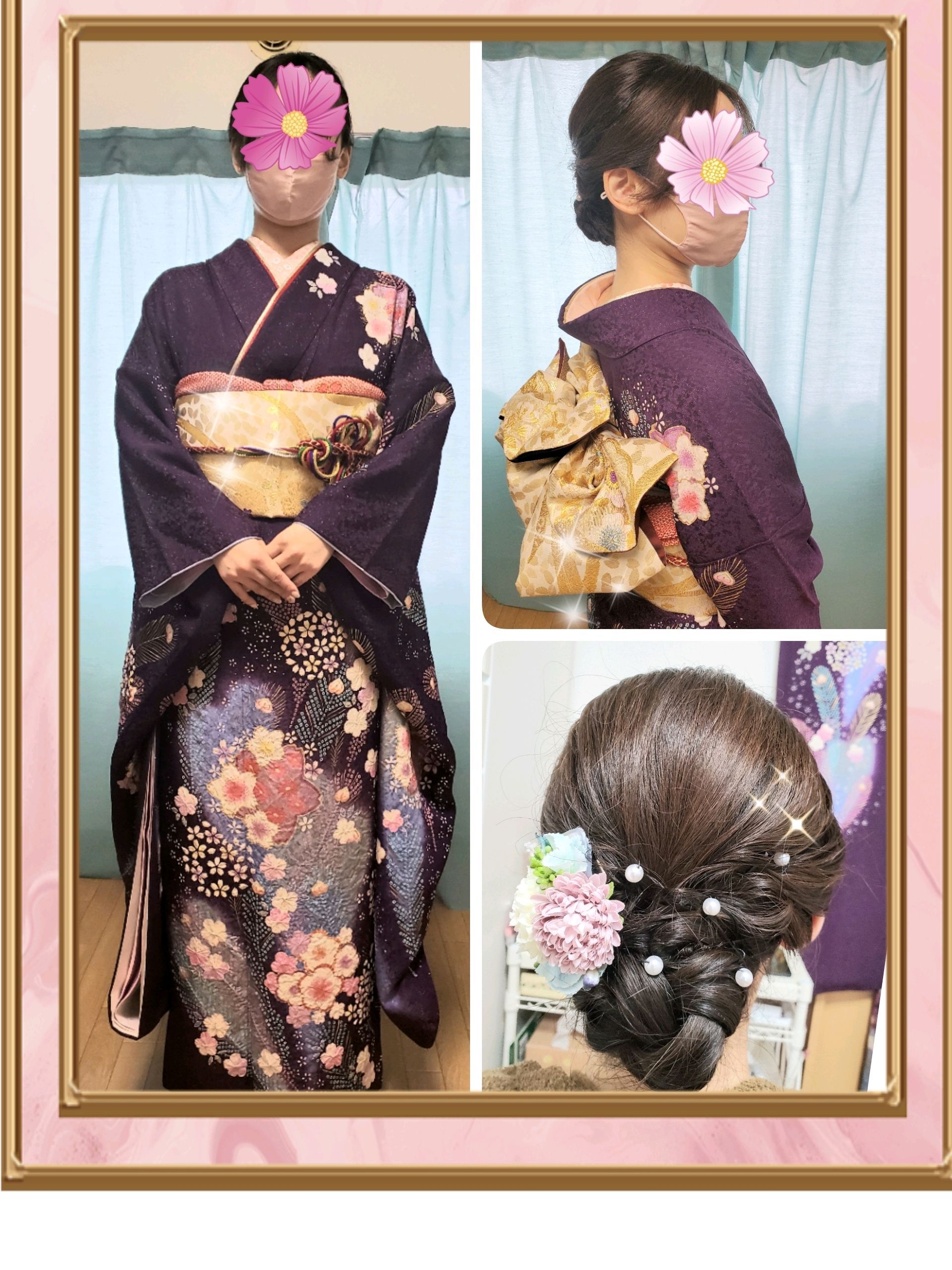 暑い1日でしたが…お振り袖を着て、結婚式に。紫のお着物が上品でとても素敵でした💕