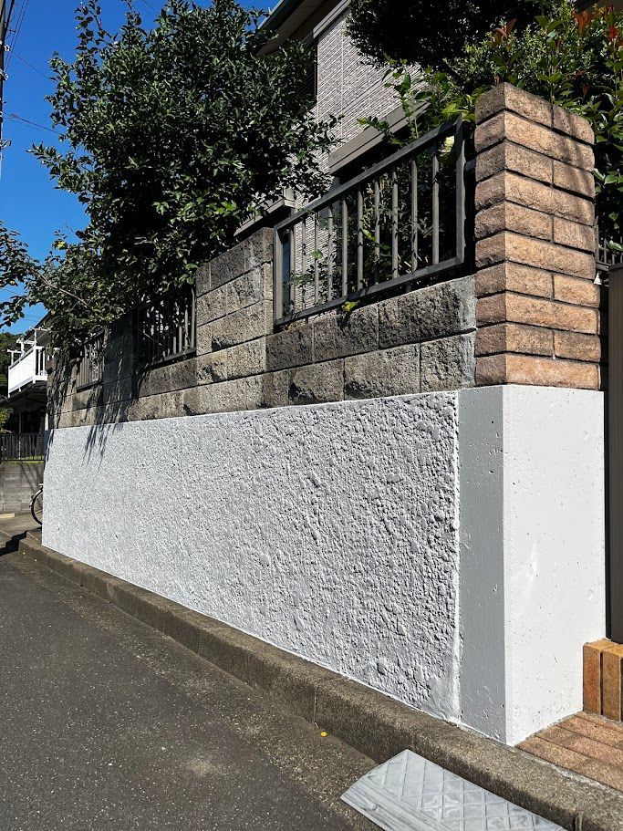 横浜市戸塚区にて、古いセメントスタッコの擁壁を塗装しました。