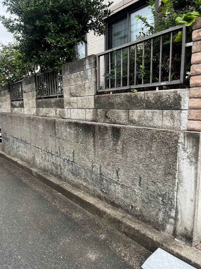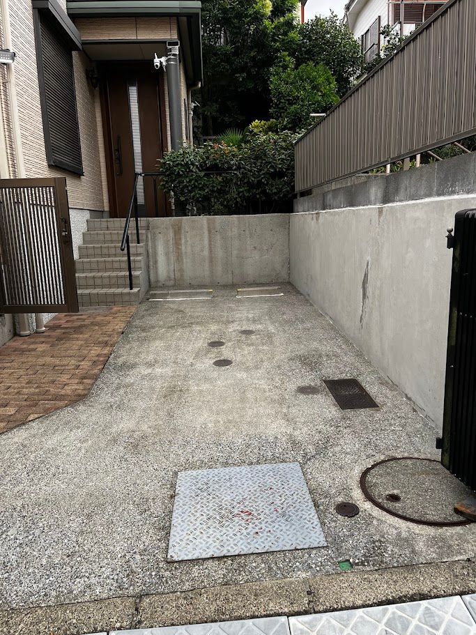 施工ではまず高圧洗浄を行い、擁壁や駐車場の土間に付着した汚れや苔をしっかりと落としました。その後、下塗りから仕上げまで丁寧に塗り重ねることで、均一で自然な質感を実現。
