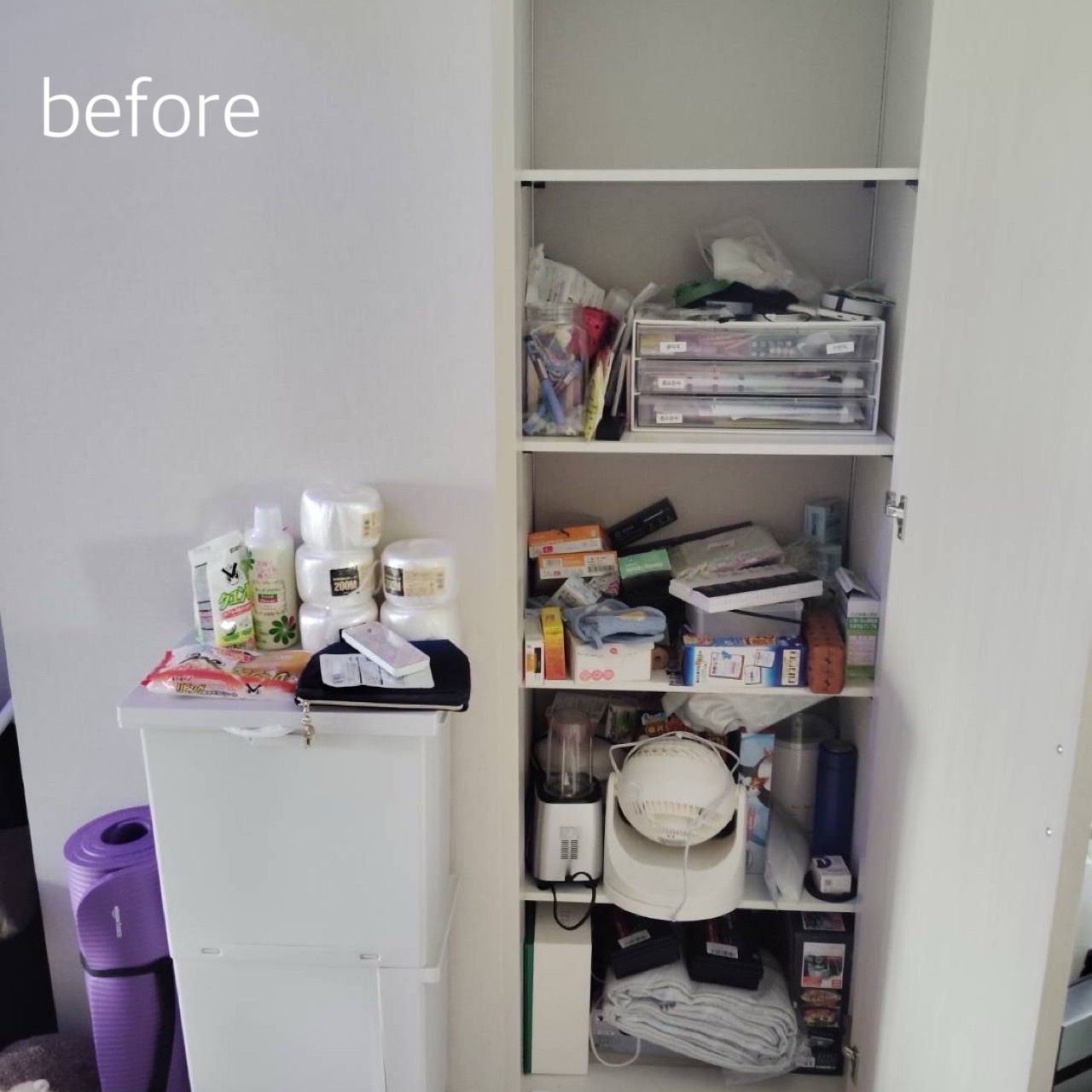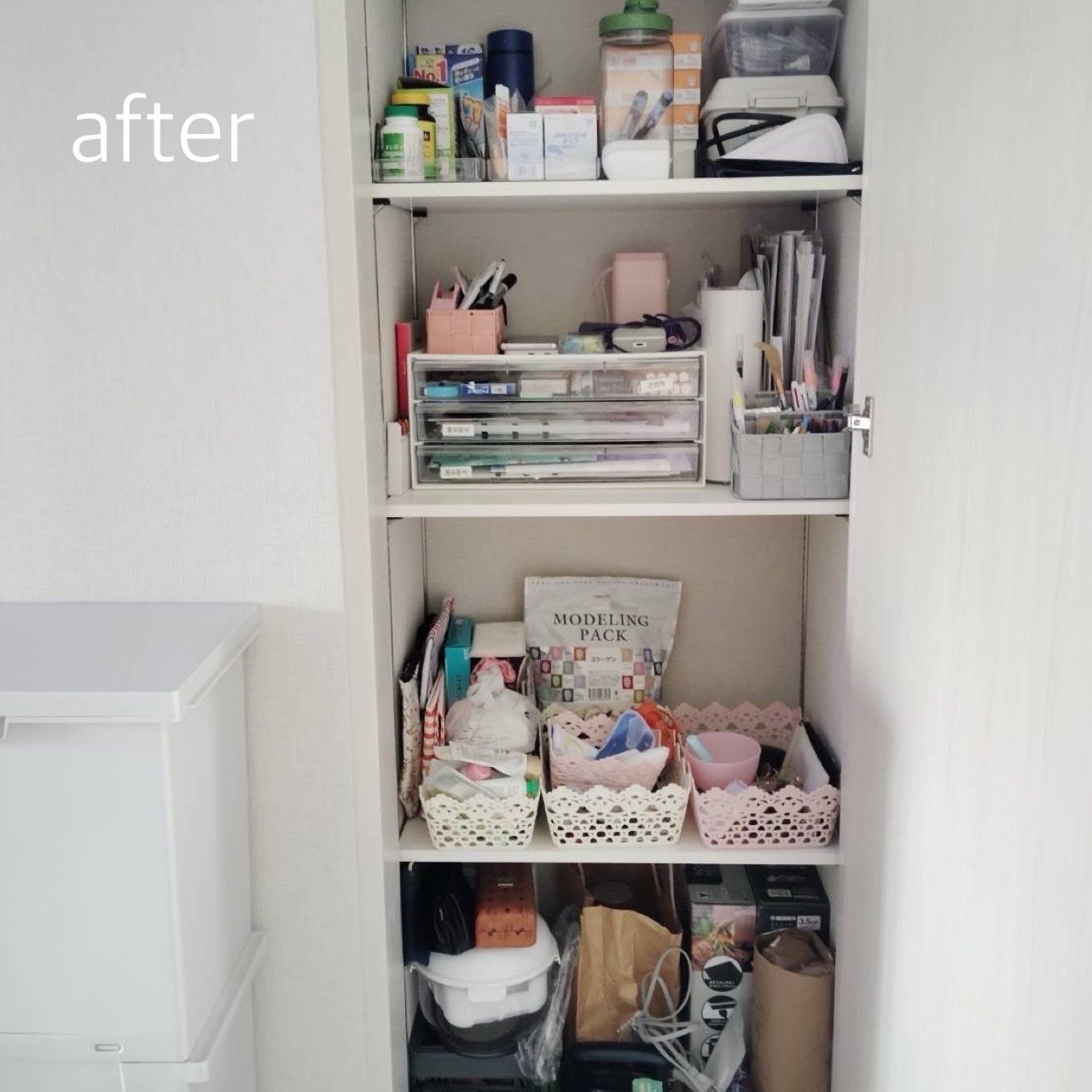 リビングに出ていた物を使う頻度や、種類に分けて収納しました👍使う頻度の高いものはすぐ手の届くところ、低いものは高いところにしました😊