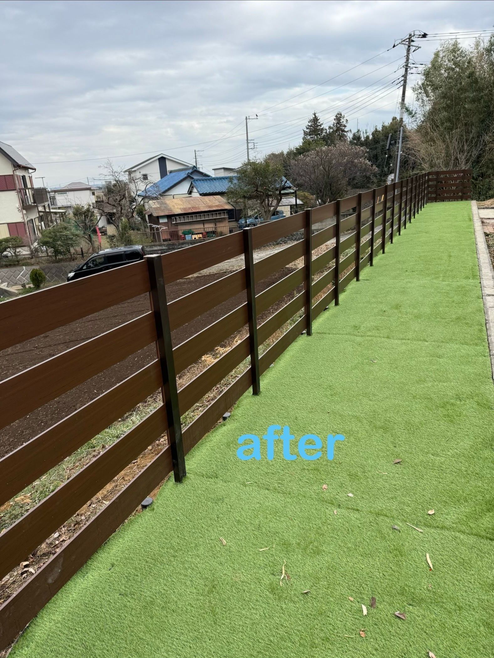 法面(のりめん)を活用した人工芝スペース+樹脂フェンス施工をさせていただきました。