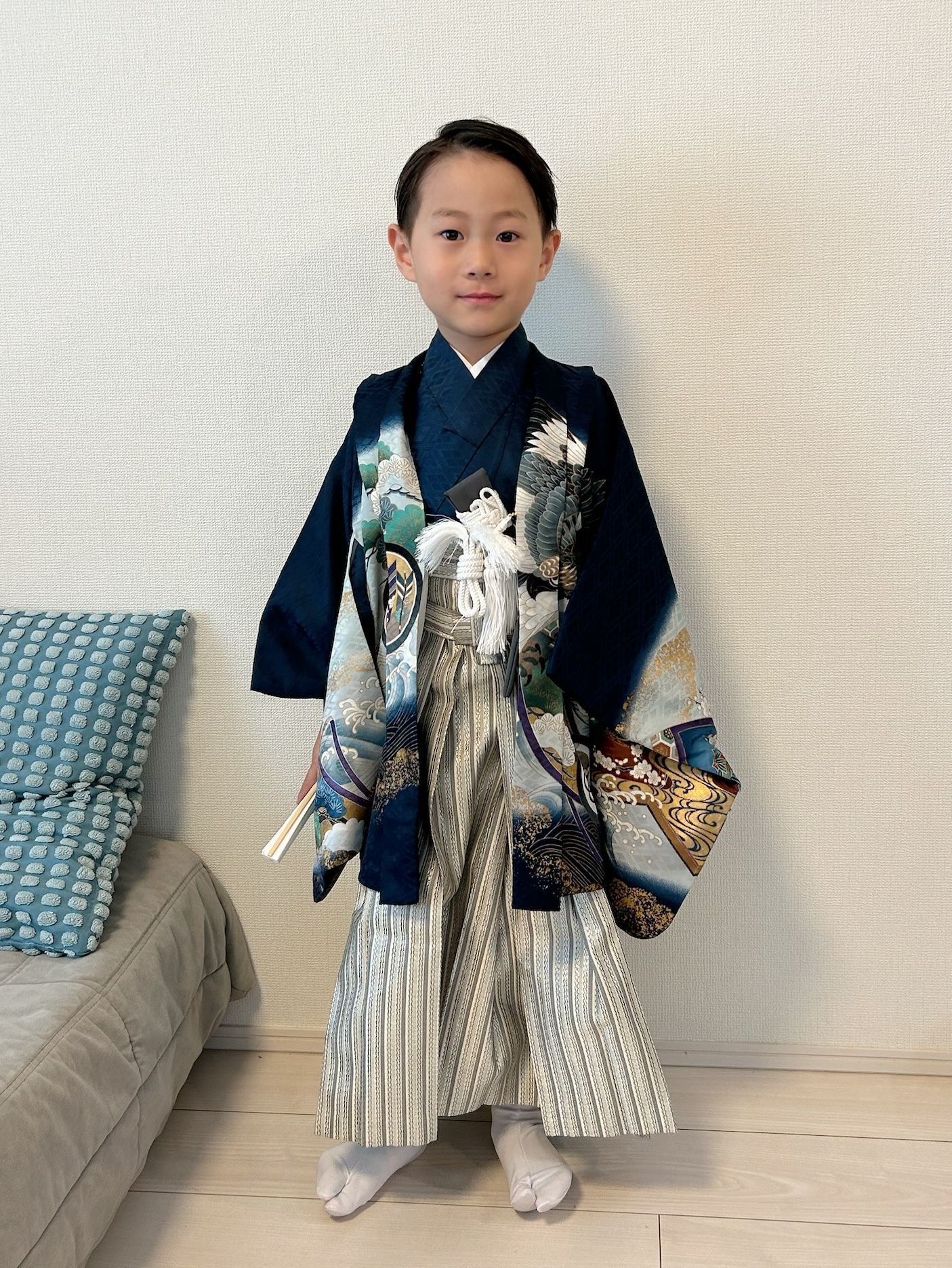 お兄ちゃんは伝統的な紺地の羽織りに