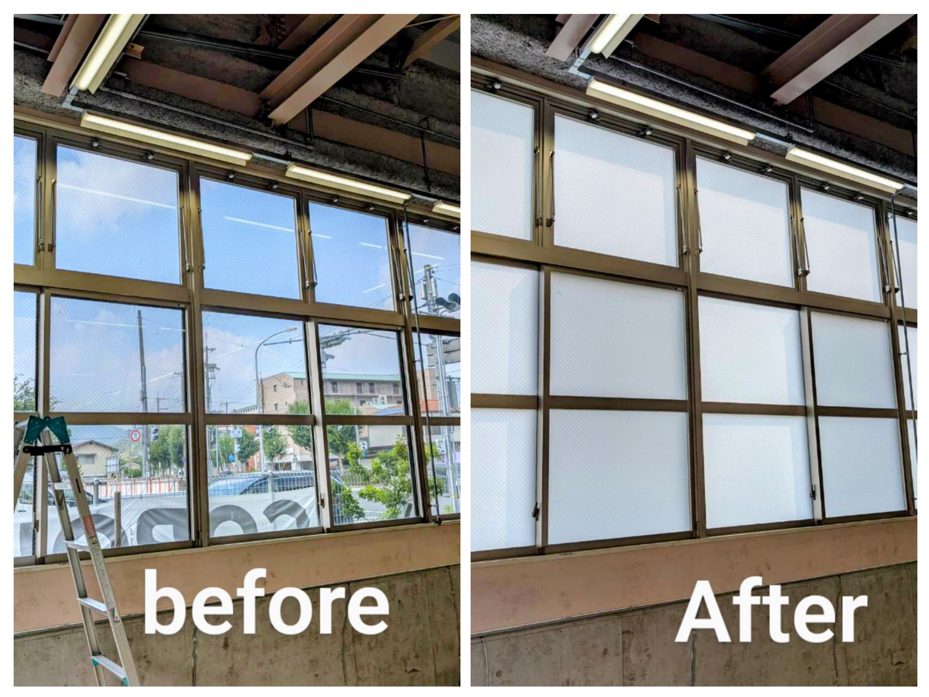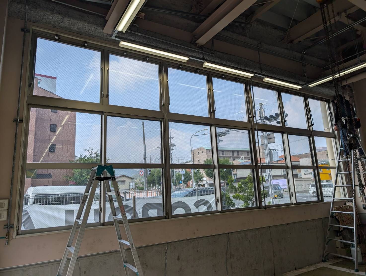 本日ご施工のトヨタ様の整備工場です。日差し調整を兼ねて、乳白色のフイルムを施工させて頂きました。お休みのところ、現場立ち会って頂きまして。ありがとうございます。
