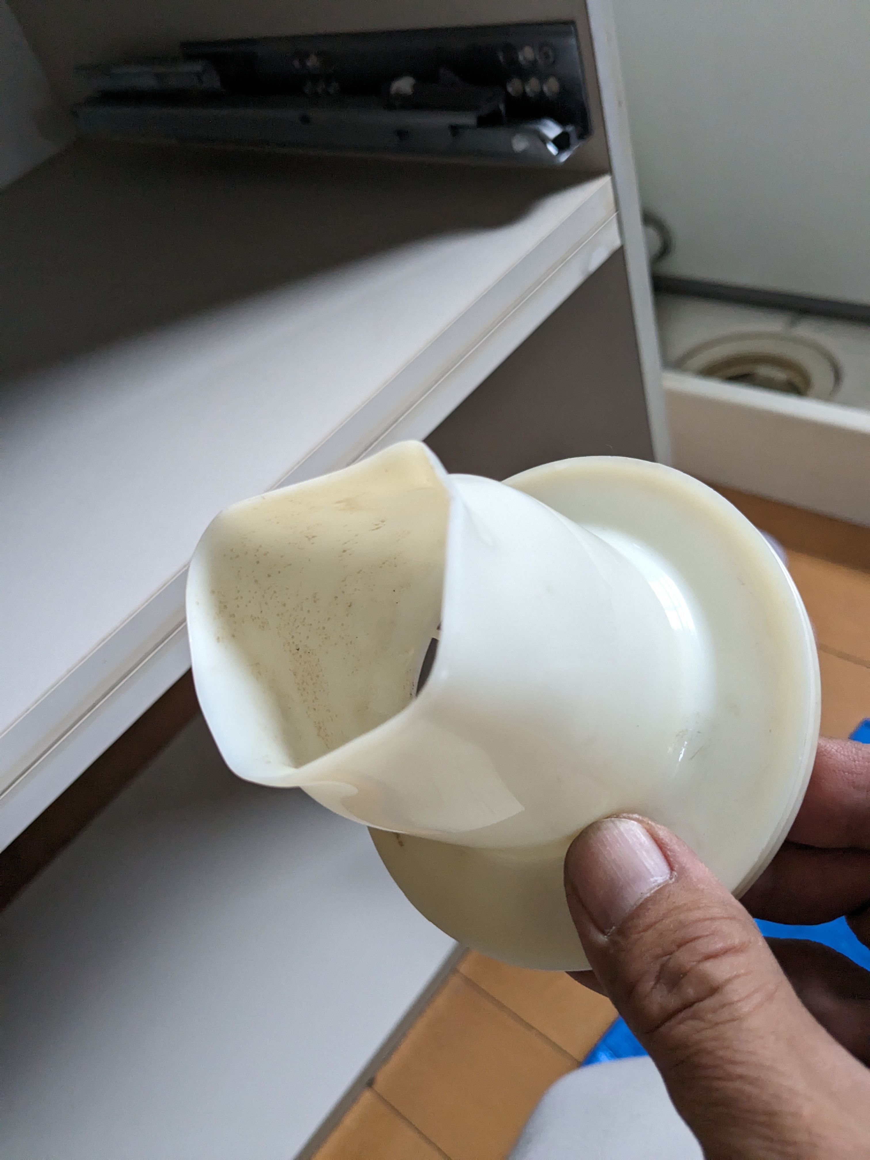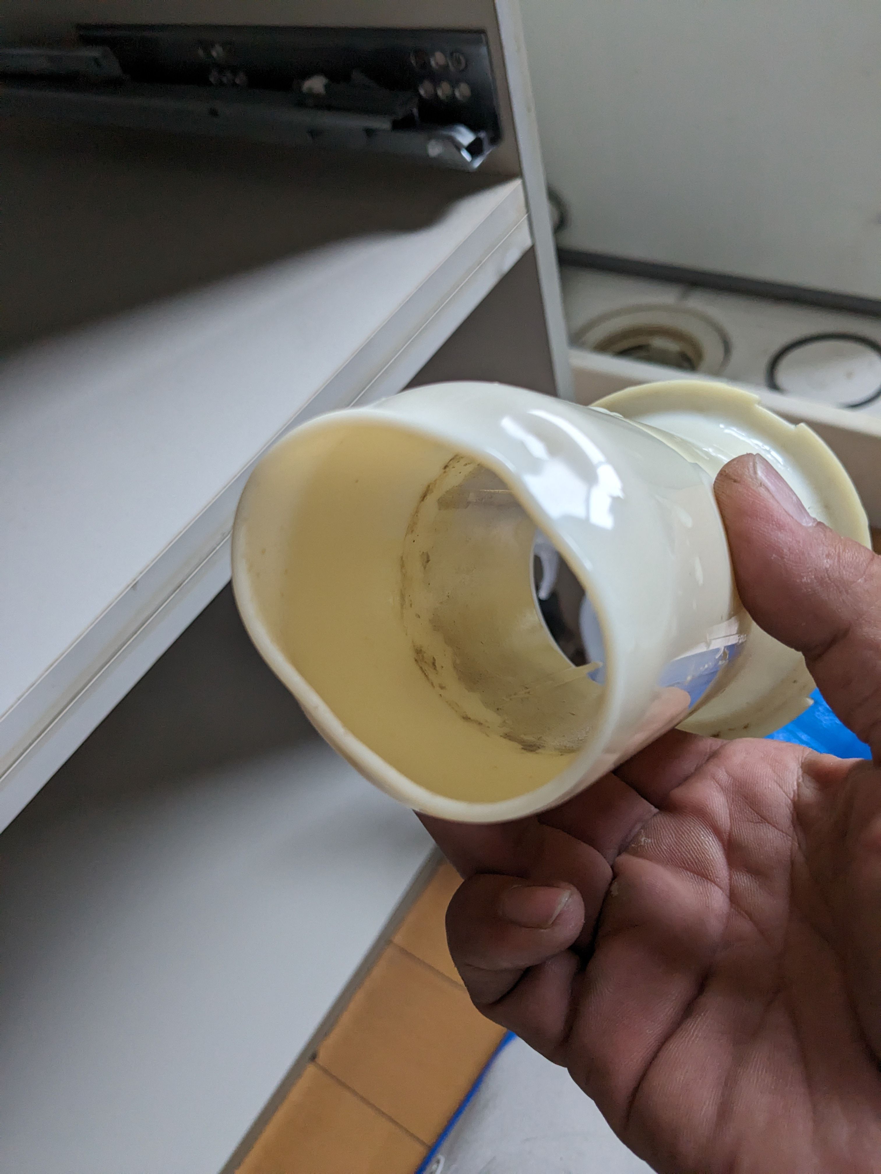 排水管から気になる音がするという事で対応させて頂き、スムーズに解消しましたが、その時に排水トラップを外したところグニャグニャに変形していた為、熱湯でも流したのかな?と思い聞いたところ、業務用の洗浄液を使ったときの化学反応による発熱だとわかりました。