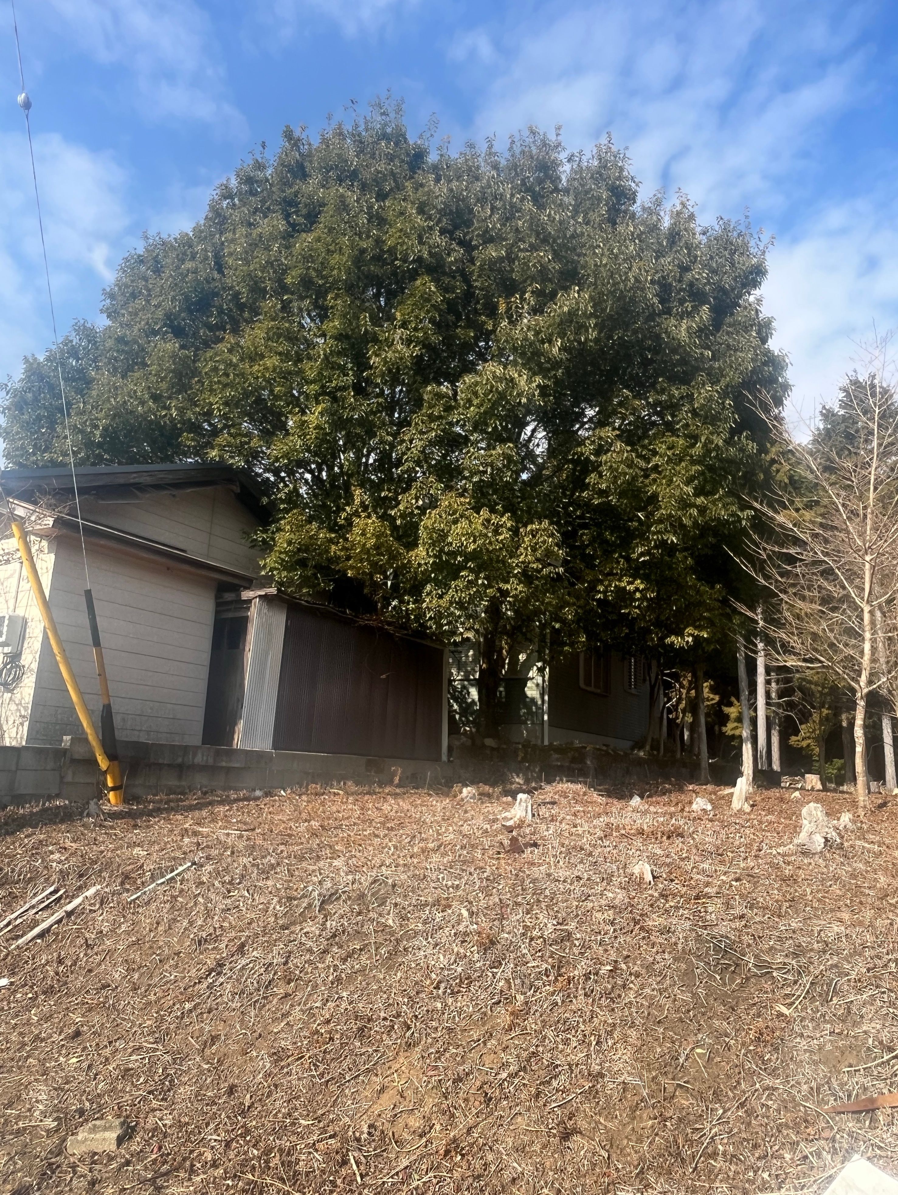 大きくなりすぎた立木の伐採です。屋根にも枝木が被さっていたので安全対策しながら慎重に作業完了しました。