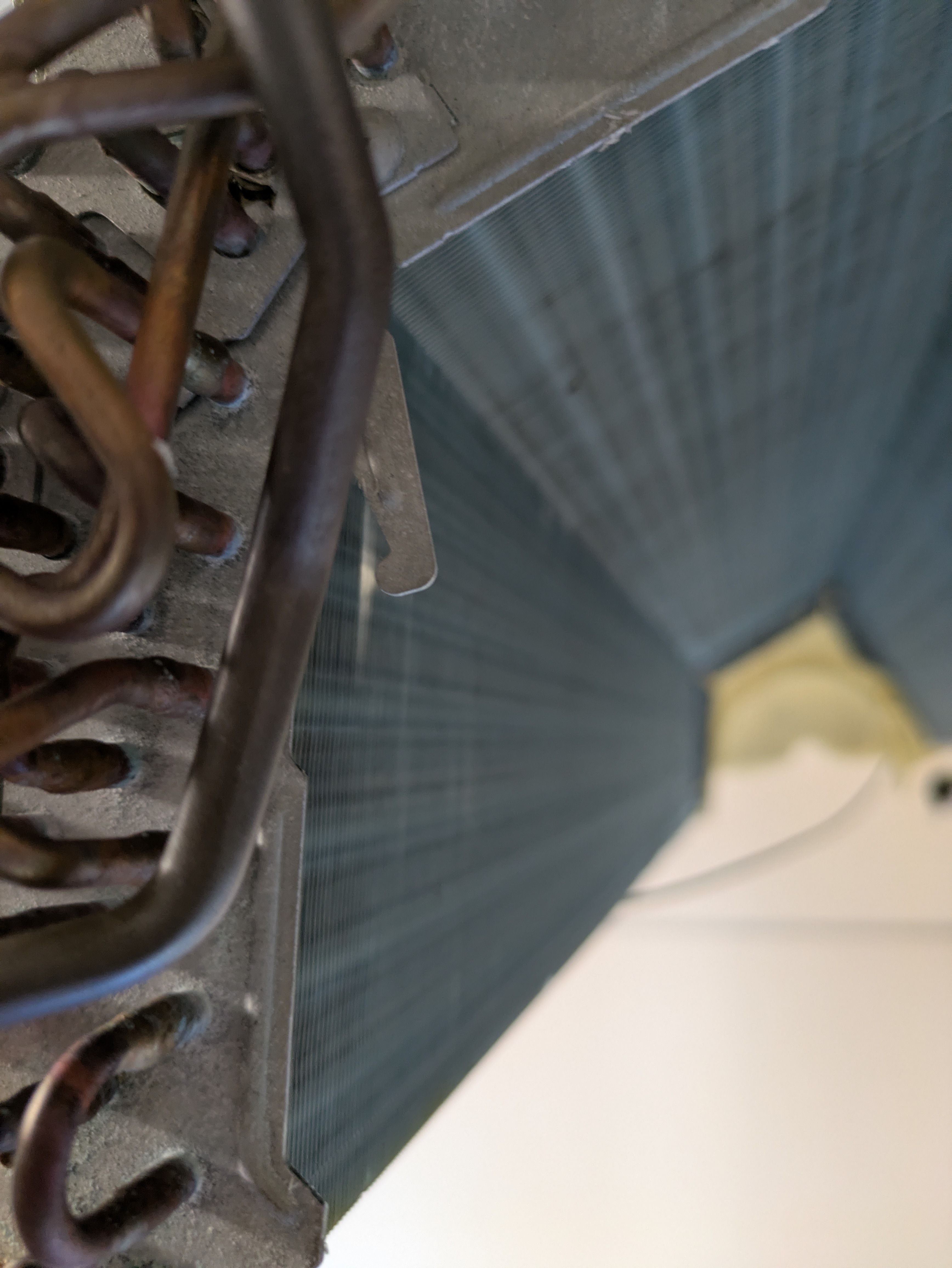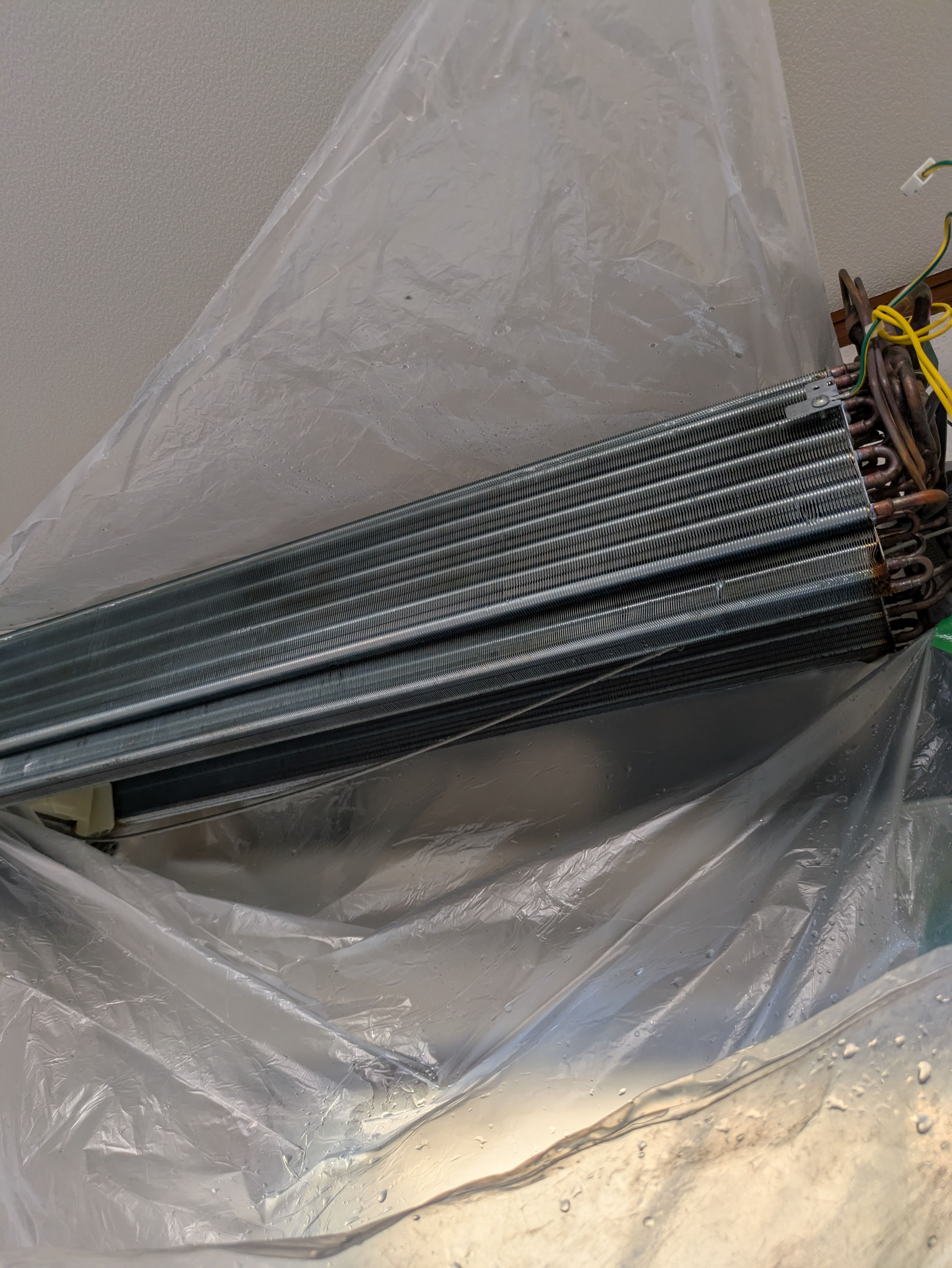最終的には背面フレームまで外す“背抜き”の状態に。壁には熱交換器(アルミフィン)だけが残り、内部の汚れがすべて見えるようになります。