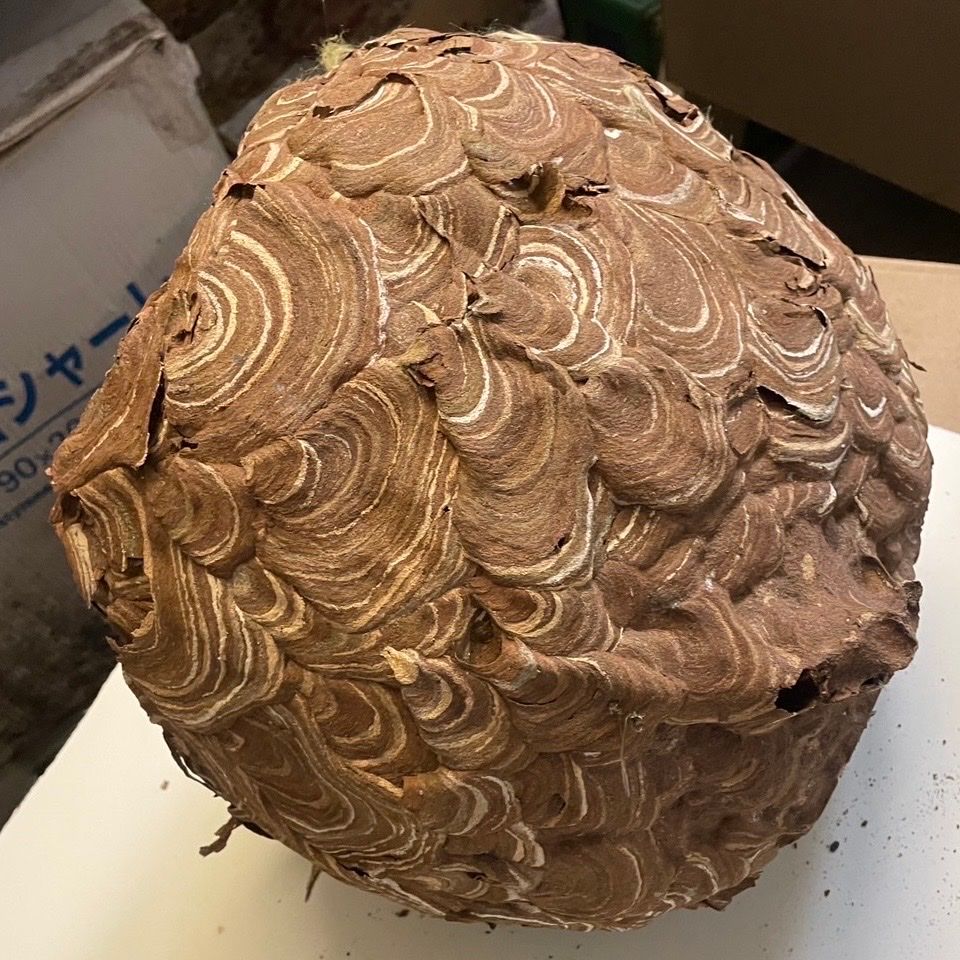 実際に行ってみると、玄関先の屋根の下に 丸々としたスズメバチの巣。