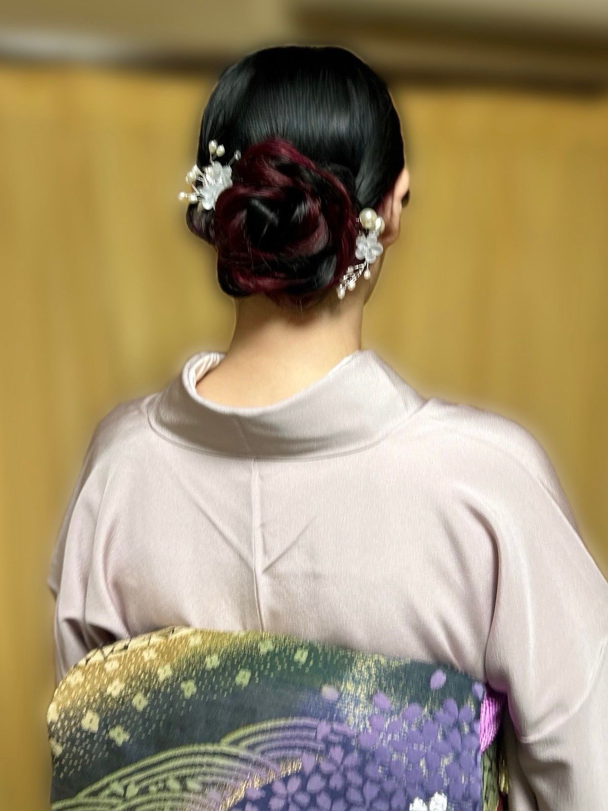 インナーカラーが映えるお花型のシニヨンもお似合いで