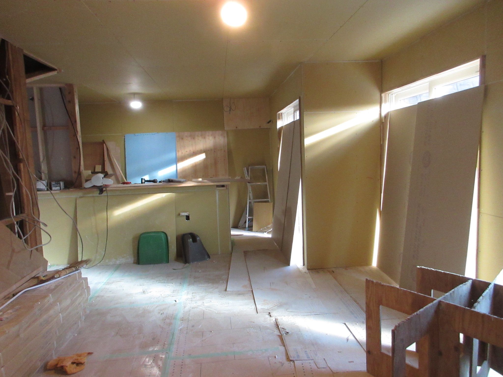 照明配線出し、窓枠、ドア枠、クローゼット枠を設置での天井石膏ボード貼りと壁の石膏ボード貼りです。