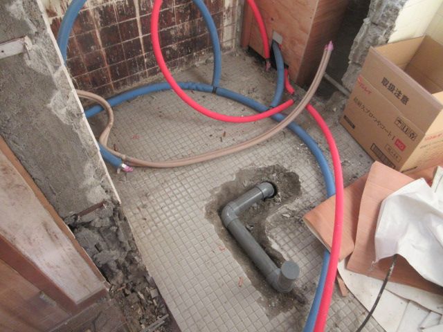 1階のトイレを撤去で床、壁、天井解体で排水、給水設備配管と換気扇、スイッチ配線です。