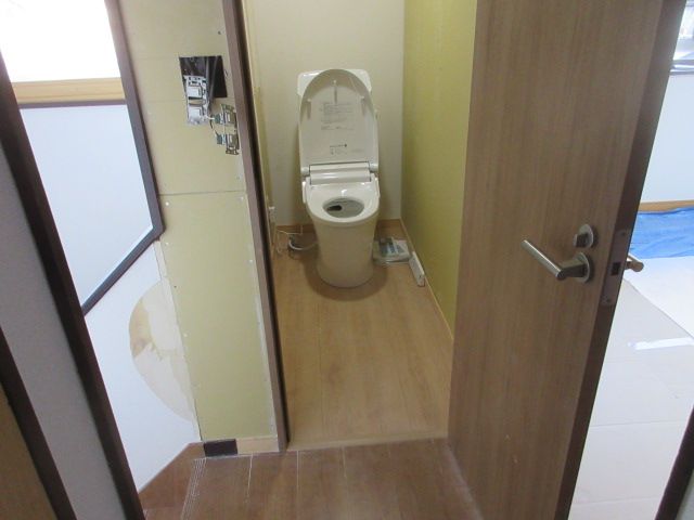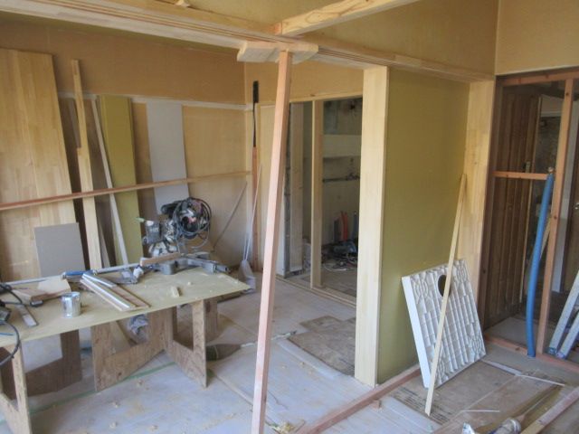 床下地組でフローリングを貼って、天井も下地を組んで石膏ボード貼で、壁を塞いで新たに新設トイレドアの設置です。