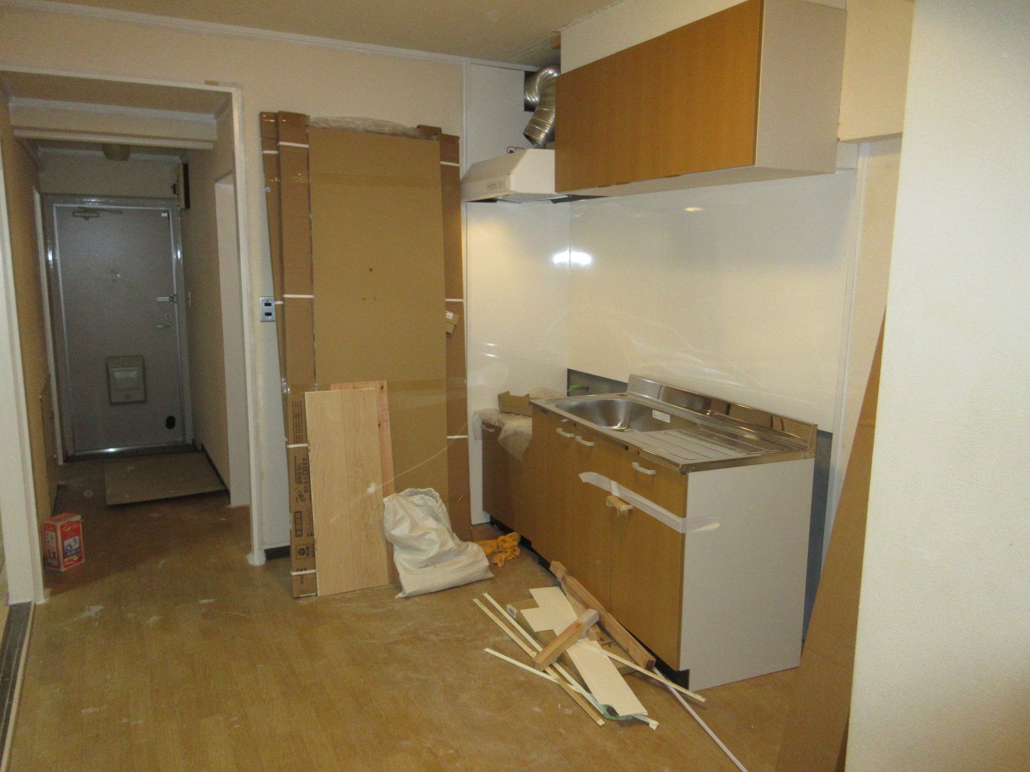 キッチンも既存キッチンを撤去で造作でキッチンパネルを貼って吊戸棚、レンジフード、手元灯、キッチンを取付ます。