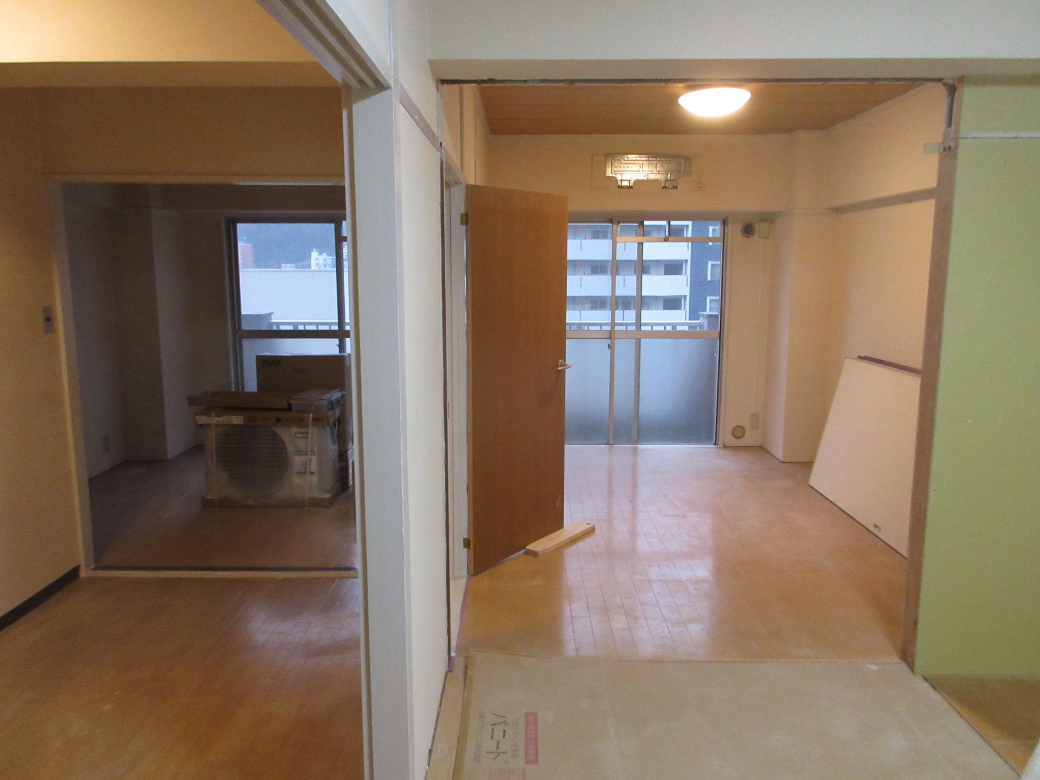 2部屋の仕切り襖も幅広で劣化が多いので造作で袖壁を付けて洋風の規格の引違いドアを設置いたします。