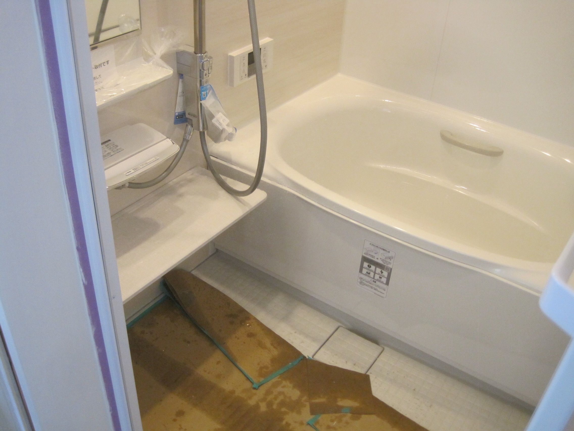 ユニットバス、電気温水器、トイレ交換、TVインターホン新設等が完了で、内装工事で開口での補強で床クッションフロー貼替が完成です。