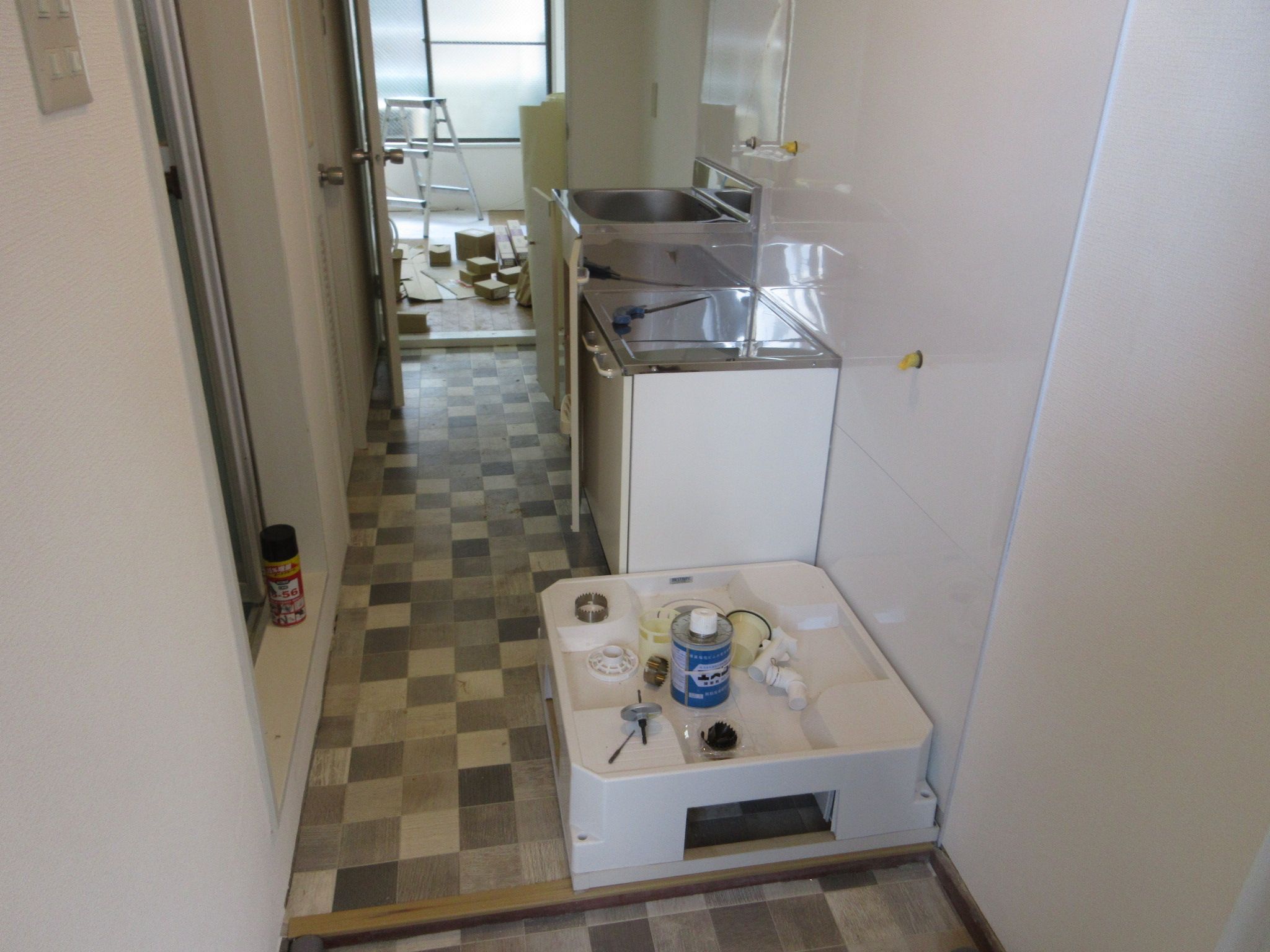 流し台設置で洗濯防水パン嵩上げ設置、それでも排水配管が干渉の流し台嵩上げ工事、排水露出変換での配管、洗濯専用コンセント新設、水栓分岐フレキ配管、洗濯専用水栓設置、ガス配管、瞬間湯沸かし器交換、キッチン換気扇交換(ダクト変換での点検口新設)、浴室換気扇交換、浴室照明交換、給湯器交換、浴室蓋交換、トイレ洗浄管、洗浄便座交換、居室換気扇交換、タンクボールタップ交換、紙巻き器交換、インターホン交換、照明交換・新設、スイッチ・コンセント交換、TV壁端子交換、カーテンレール交換、エアコン交換、建具調整、アルミ上り框設置、ドアポスト交換等とリフォームの玉手箱です。