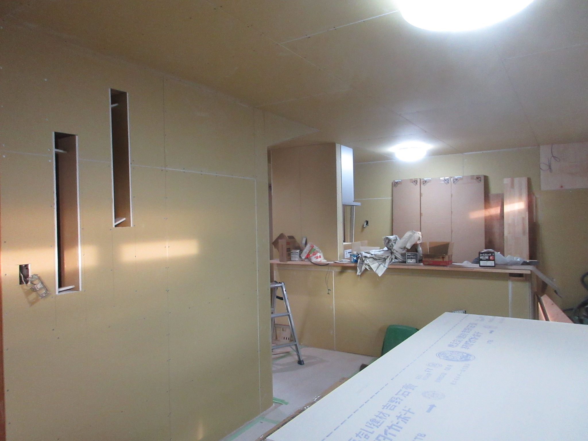 対面キッチ設置完了で、壁・天井石膏ボード貼、和室の大壁での洋室化壁・天井貼です。