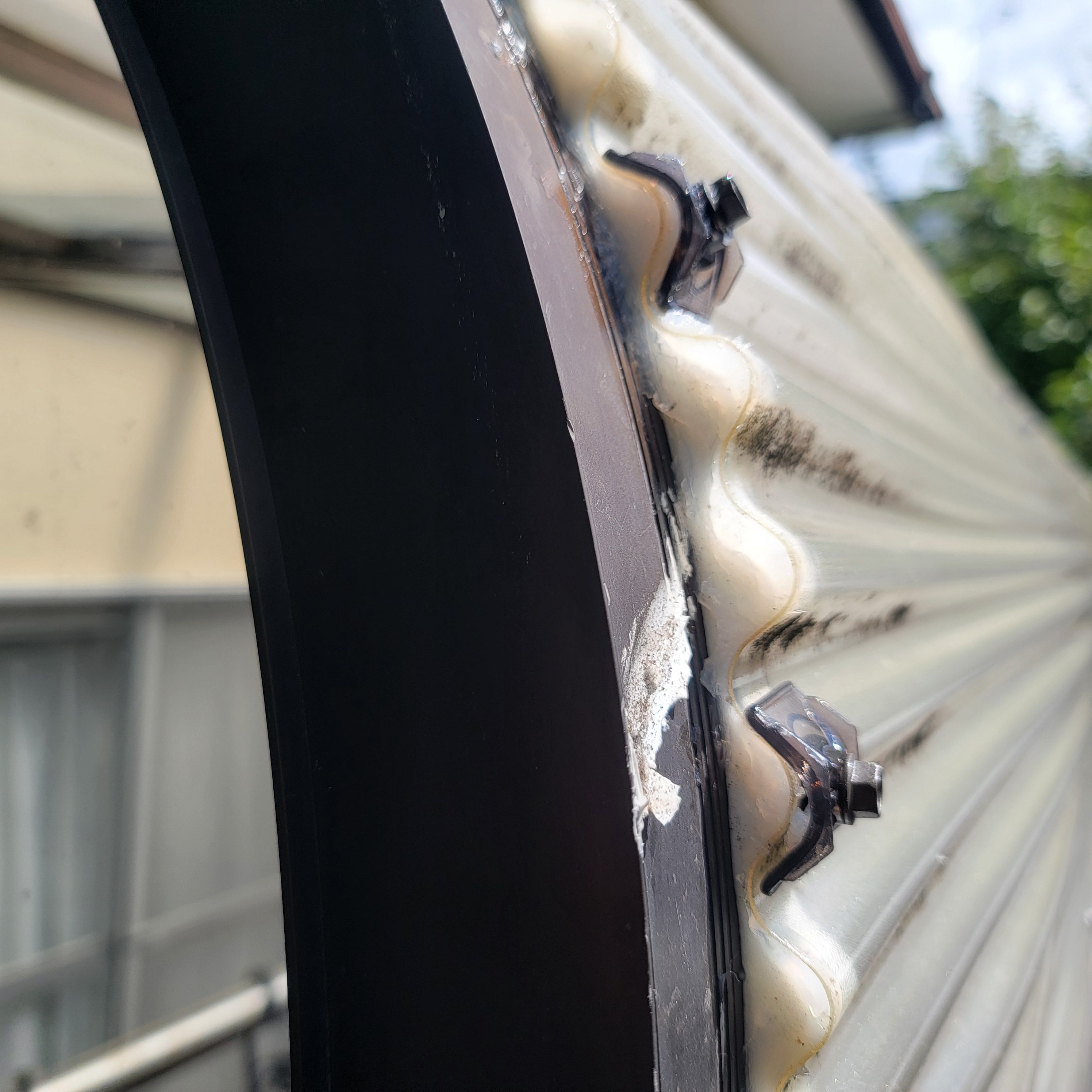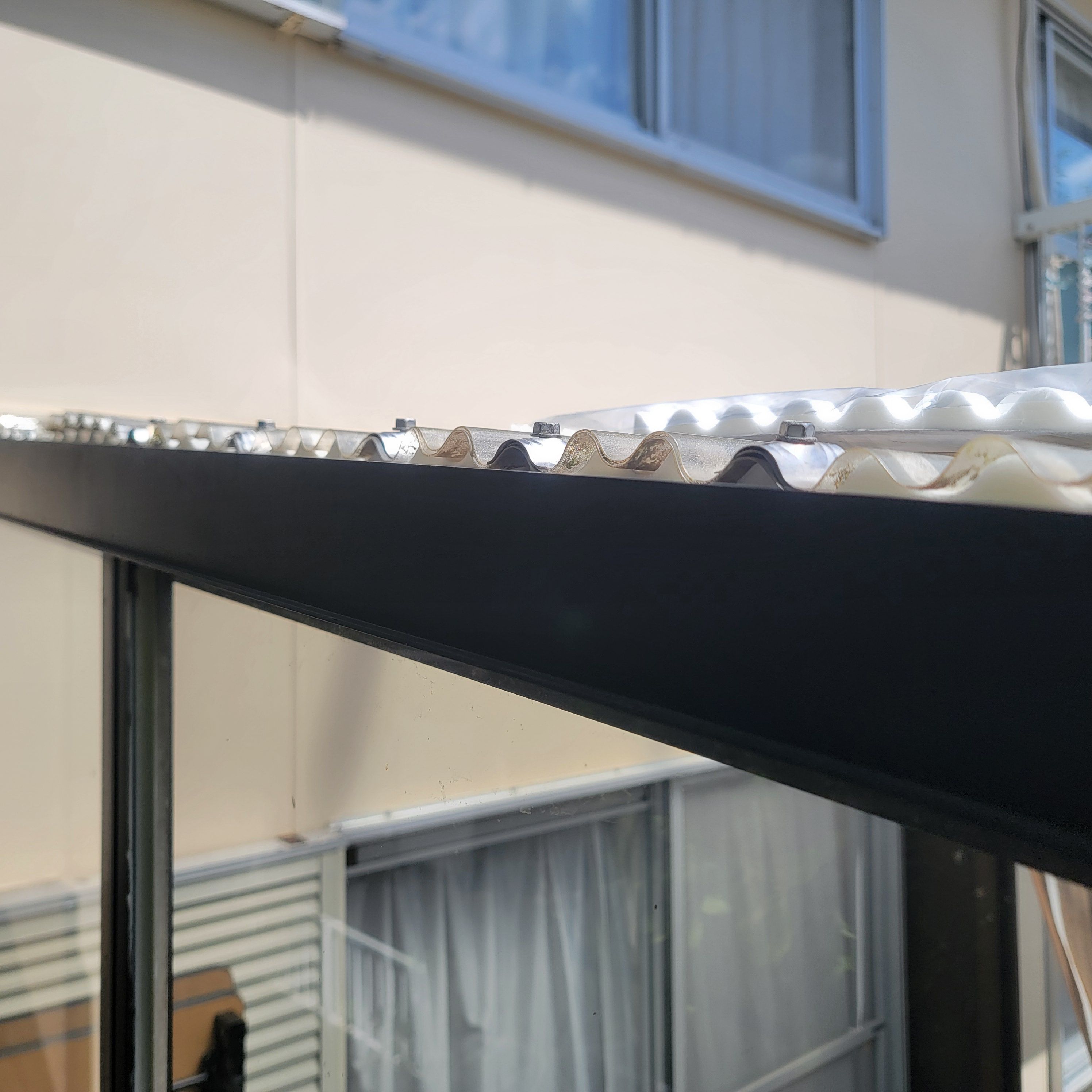 サンルームの屋根部分にはポリカ波板が貼られておりかなり古くなっていましたが、なるべく費用を押さえて欲しいとの事なので波板を一度外して波板パッキンとコーキングでの簡易補修となりました。