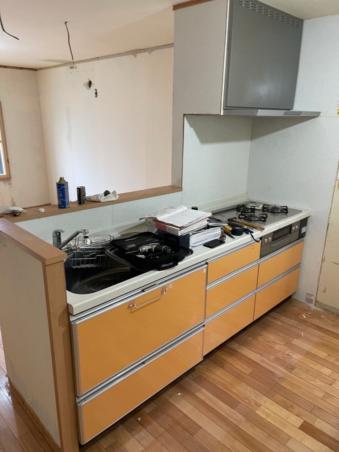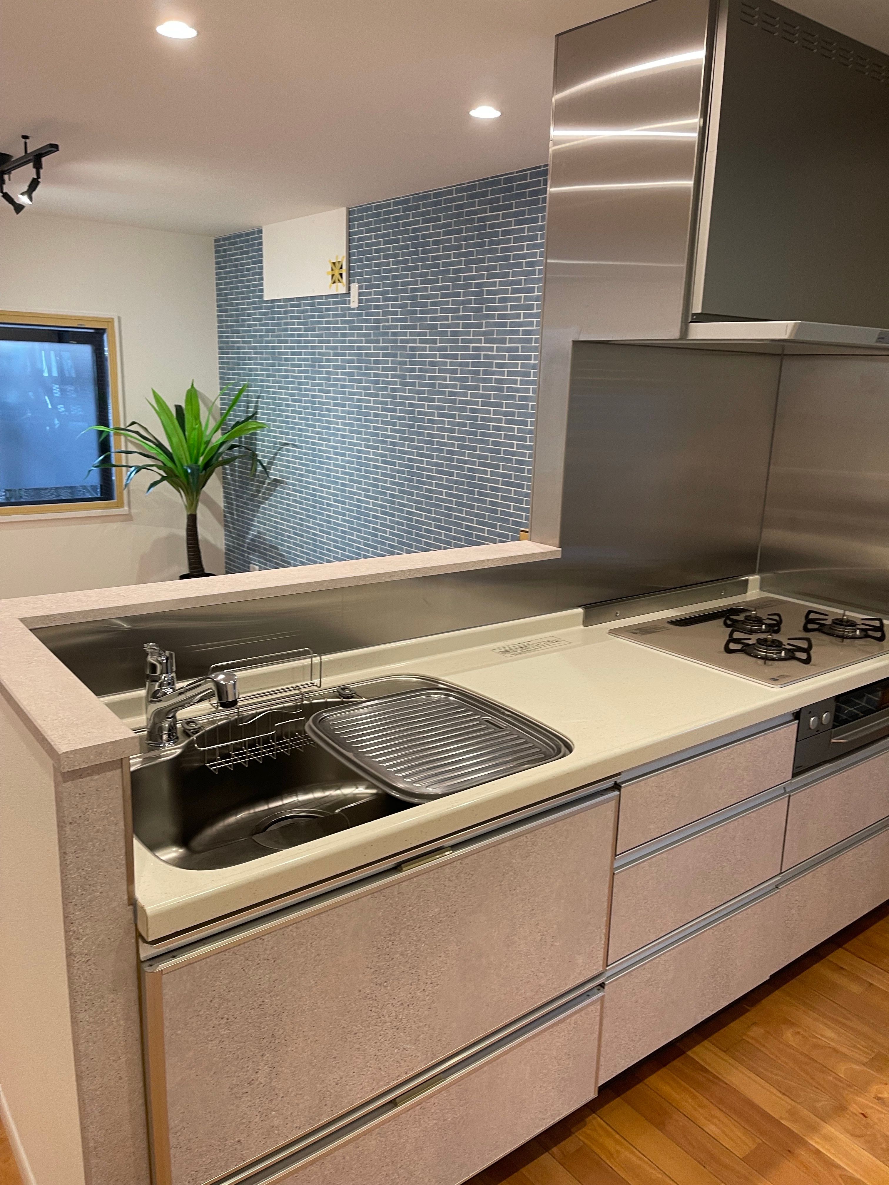 今回は、当社におまかせで工事をやらせて頂きました。なるべく低予算で且つ綺麗にオサレにと希望されたので、プロの知恵を振り絞ってやりました。キッチンは扉シート、水洗金具交換、キッチンパネル増し貼りのステンレスパネル。