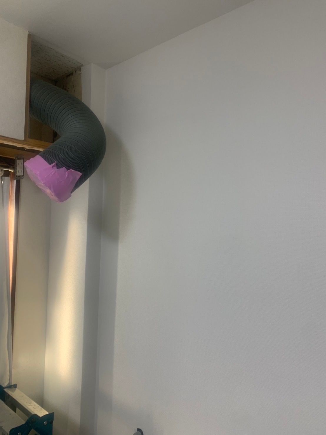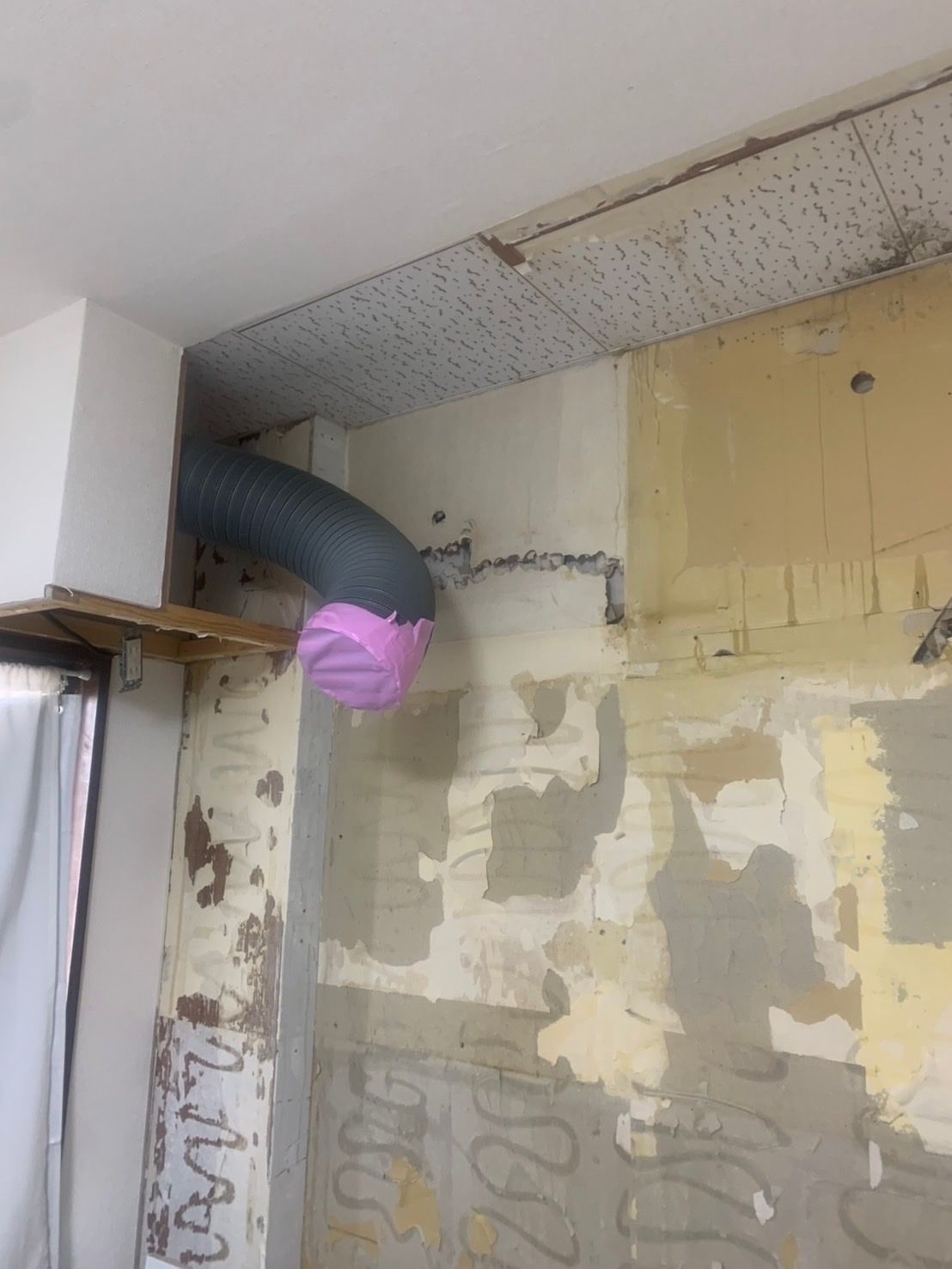 今回はキッチンの交換工事になります。キッチン解体すると前の壁がかなり破損します。見えなくなる所ですが、当社では必ずキレイにクロスを貼ってから施工します。裏側になる所ですが、お客様の気になる部分も細かく収めて行きます。