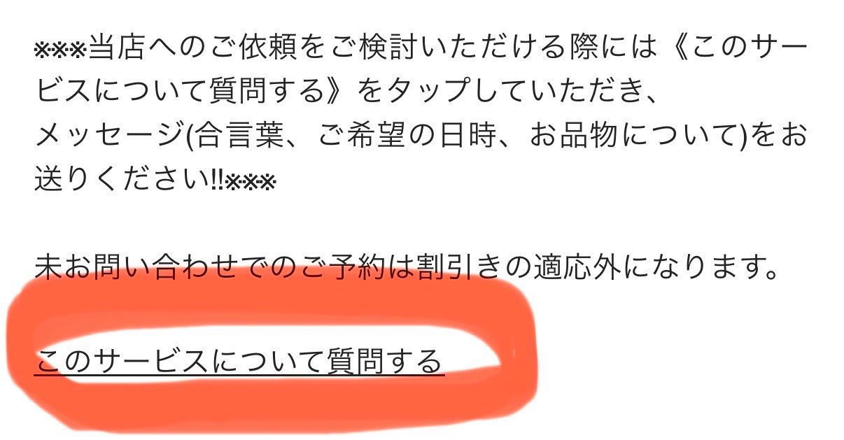 サービスページの このサービスについて質問する の文字の部分をタップいただきますと、匿名でお問い合わせのメッセージを店舗に送ることができます。