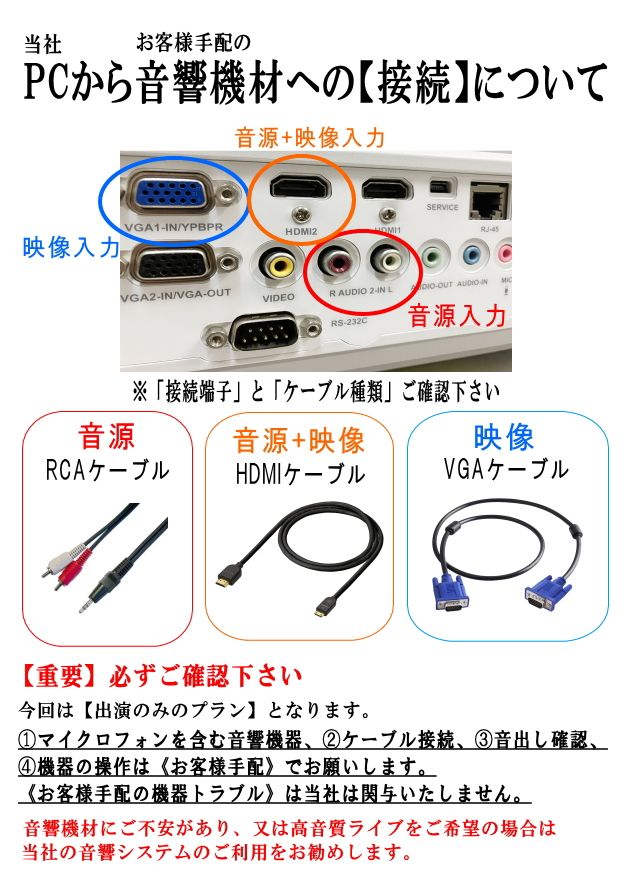 音響機器をご用意していただく場合、 お客様手配の音響機器と、当社のパソコンとの接続方法につきましてご案内させていただきます。