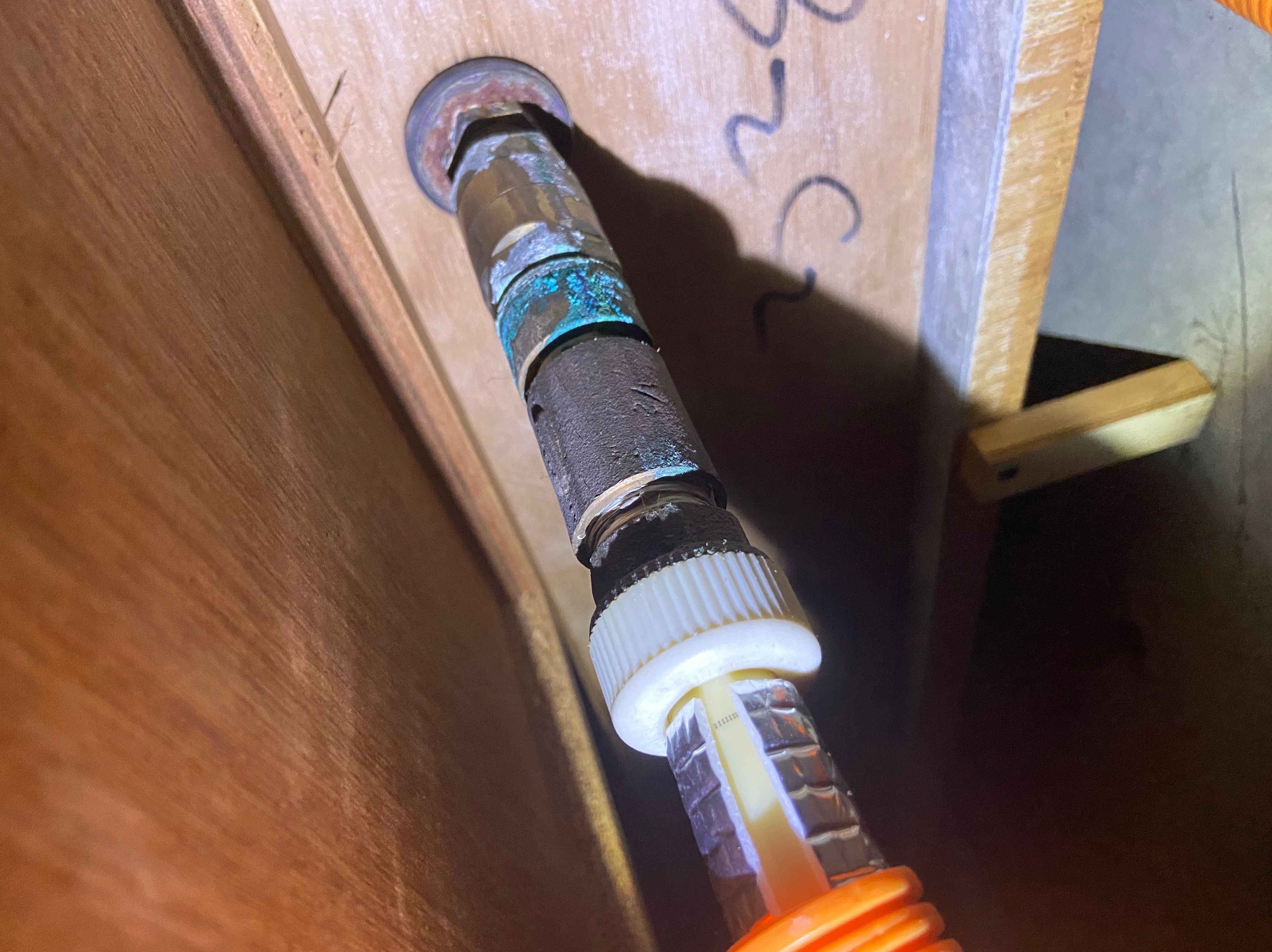 通常は止水栓があり、そこからフレキ管で接続されているのですが、色々と部材が間に挟んでいる状態でした。