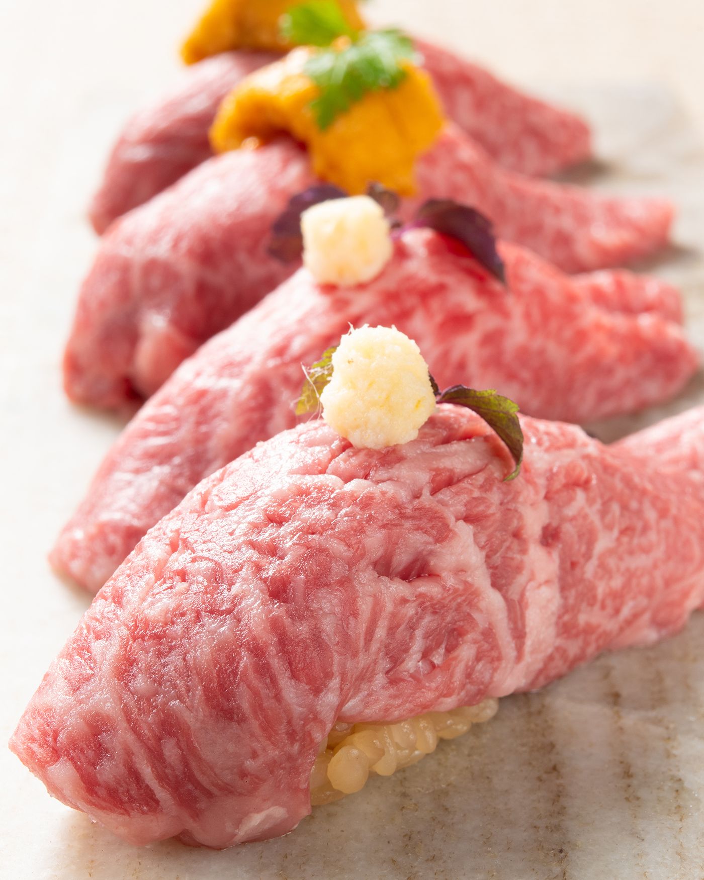 六本木の街は、夜になると光の粒が宙に舞う。喧噪を背に扉をくぐれば、そこには静謐な舞台が広がっていた。肉割烹「月灯花」。凛とした空気の中、私がレンズを向けたのは、ひと握りの肉寿司である。